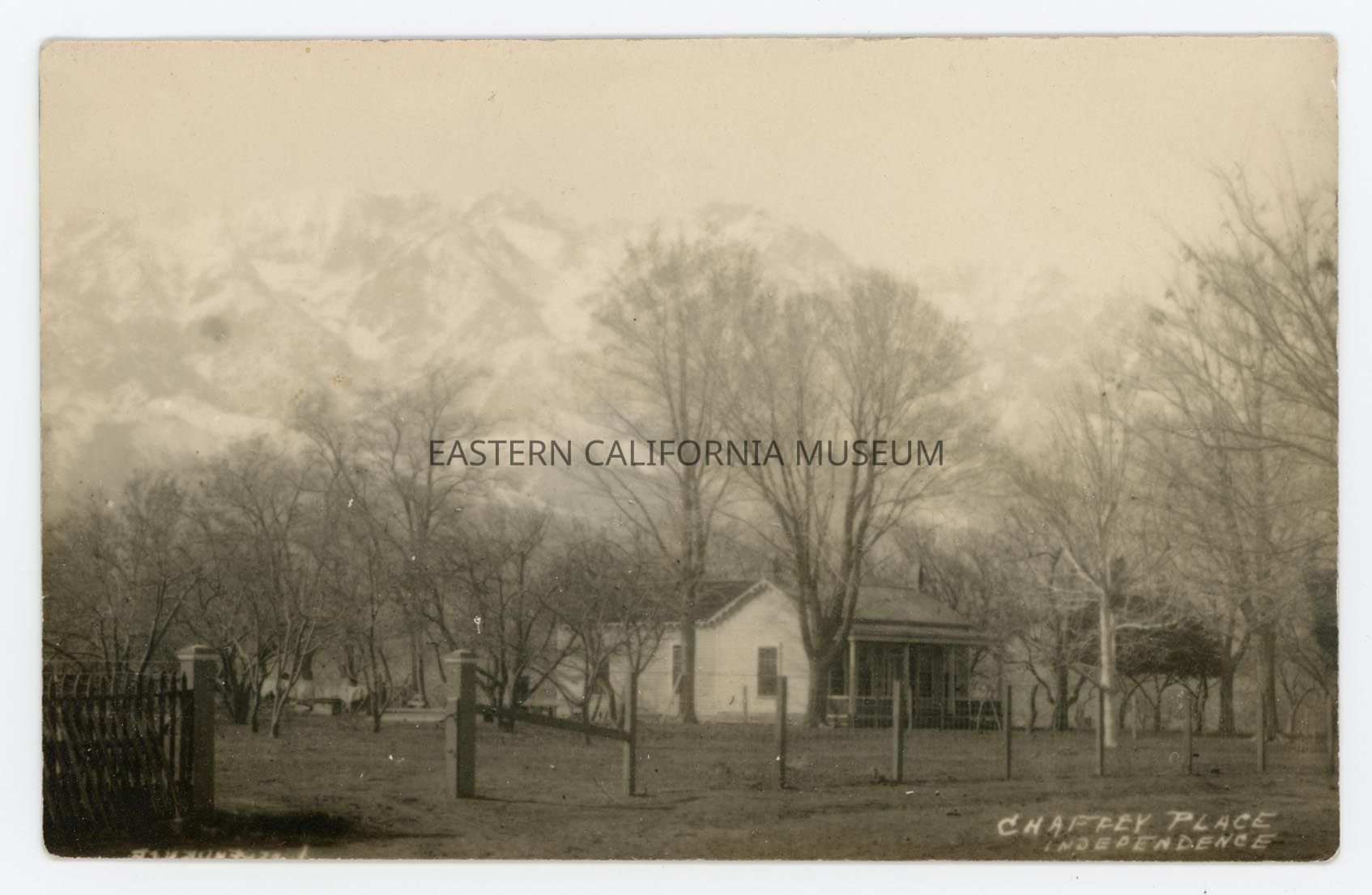 Photo postcard of a house, fence, tress, and snow-covered Sierra Nevada mountain range in background. It is titled, "Chaffey Place, Independence."