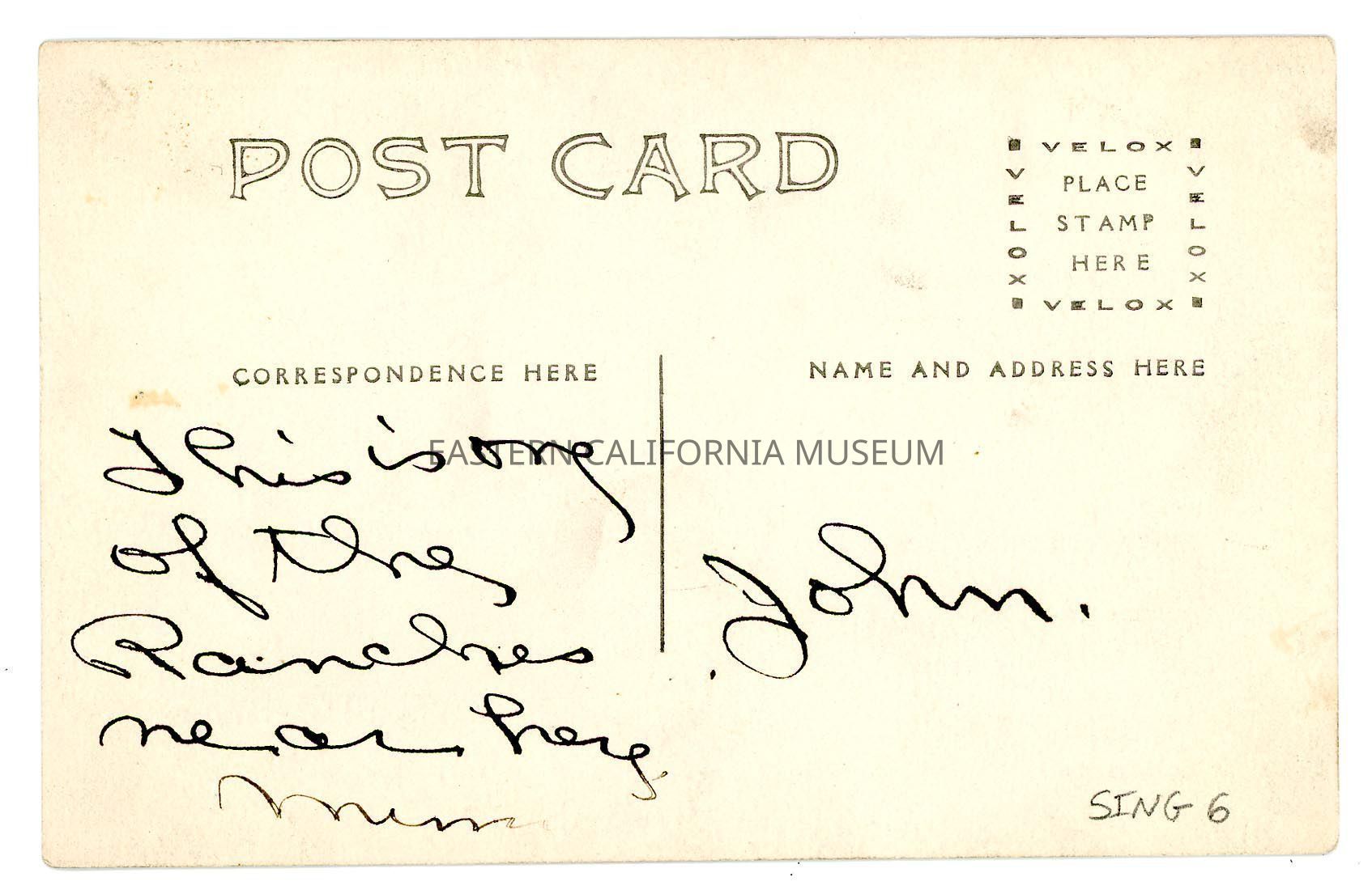This postcard was likely written circa 1908, before John Singlaub and his family moved to the Owens Valley in 1909.Photograph Details