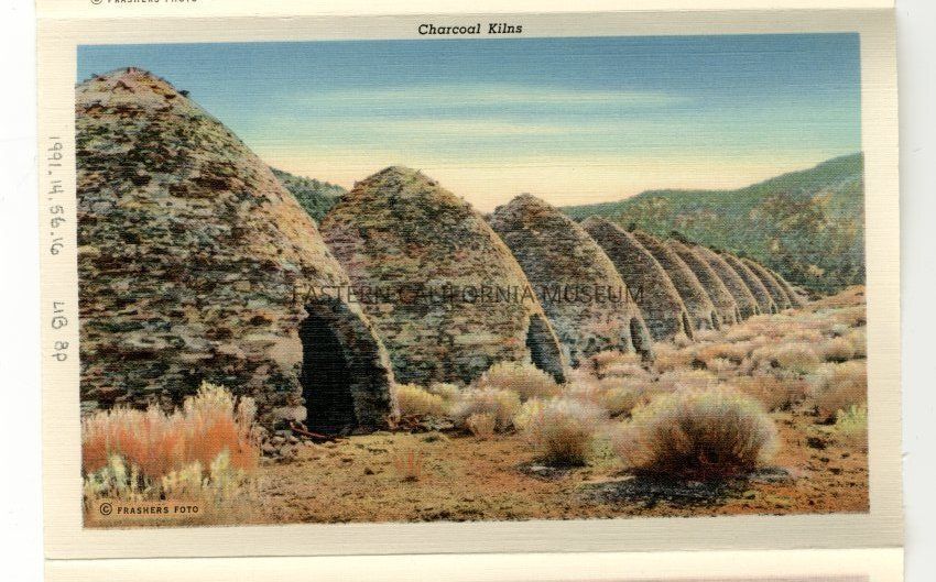 Color print of a row of charcoal kilns in Wildrose Canyon in Death Valley. It is on textured paper.