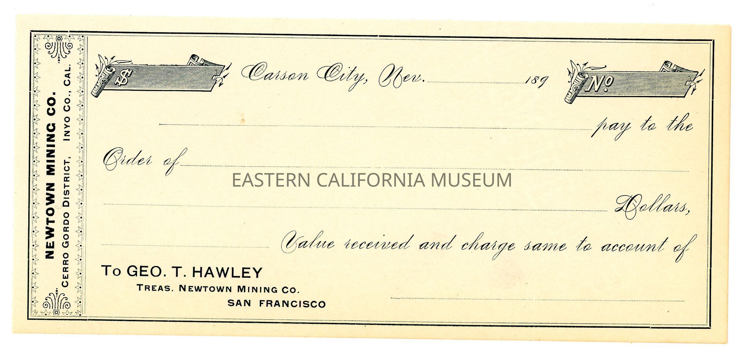 Blank check from the Newton Mining Co., Cerro Gordo District, Inyo Co., Cal. In the lower left corner it is printed with the information of Geo. T. Hawley, Treas. Newtown Mining Co., San Francisco. It is pre-filled in with Carson City, Nev. and a date of 189_.