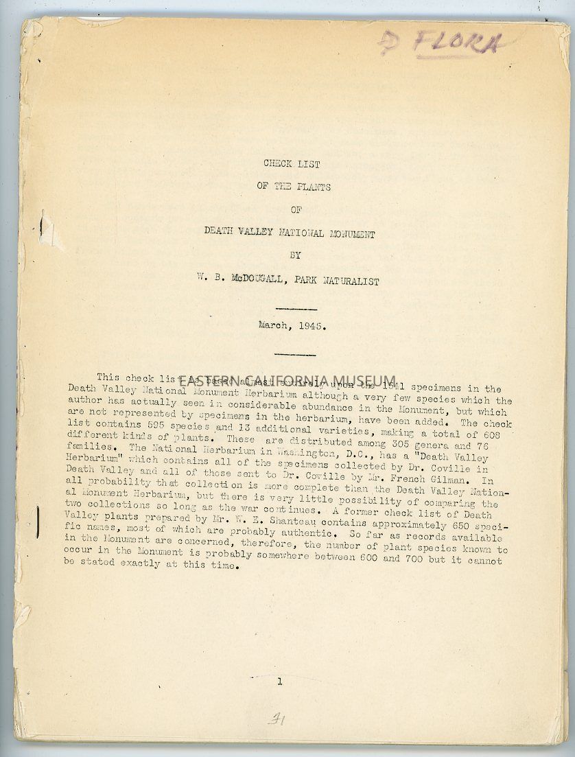 "Check List of the Plants of Death Valley National Monument" is an unbound manuscript consisting of 47 typewritten pages stapled together.Publication Details