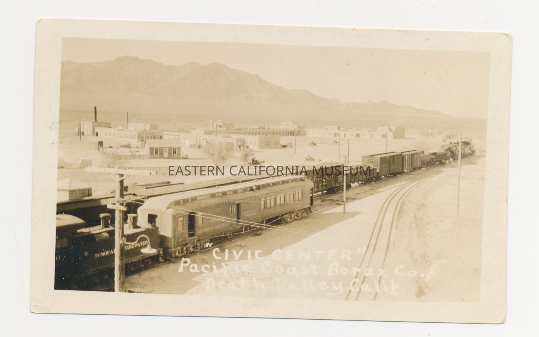 Photo postcard titled, ""Civic Center" Pacific Coast Borax Co., Death Valley, Calif." showing a Tonopah and Tidewater engine pulling a Bullfrog Goldfield Railroad car. There is a second train on the tracks behind them that have boxcars and open-top cars (hauling ore?). The town of Death Valley Junction is visible in the background.