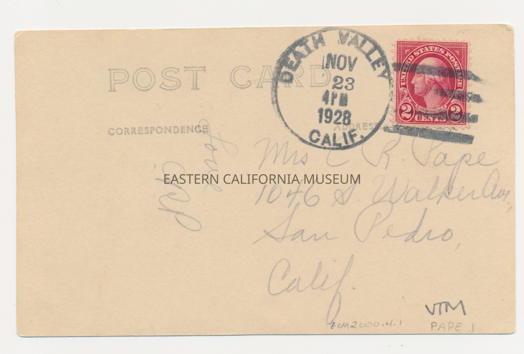 The postcard was sent to Mrs. C. R. Pape of San Pedro, CA from Death Valley on November 23, 1928. It has a red two cent George Washington stamp. The message just says, "Love CRP."Photograph Details