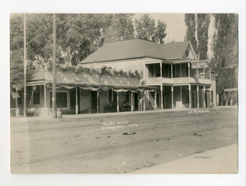 Photograph of the Clark House or Hotel in Bishop. It is a Forbes photo #1522. Photo is of a dirt street and two story hotel. There is a power or telephone pole to the left, and the attached one story building to the left is draped with bunting or fabric. A few people are sitting in the shade in front of the building, and a few more are up on the second story sitting area. There are lots of trees in the background.Collection