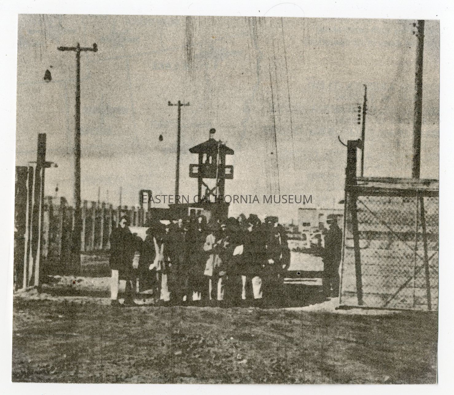 Clipping of a photo of a group of people huddled at the entrance of a fenced in location. There is a guard or watch tower in the background.