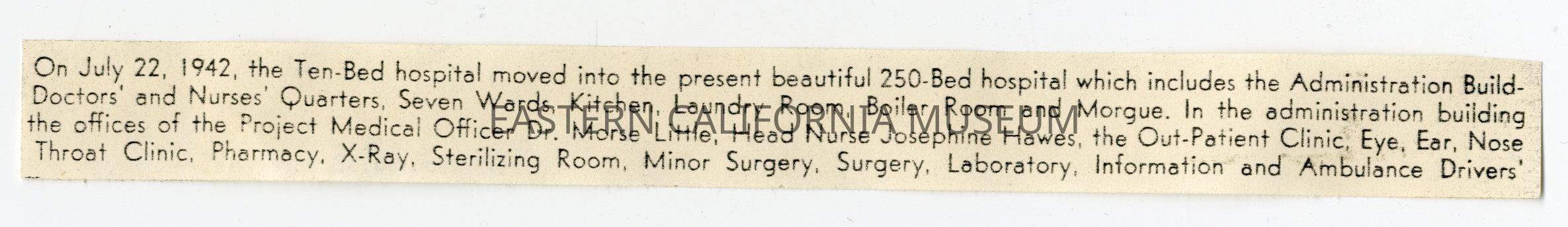 Clipping that says, "On July 22, 1942, the Ten-Bed hospital moved into the present beautiful 250-Bed hospital which includes the Administration Build - Doctors' and Nurses' Quarters, Seven Wards, Kitchen, Laundry Room, Boiler Room and Morgue. In the administration building the offices of the Project Medical Officer Dr. Morse Little, Head Nurse Josephine Hawes, the Out-Patient Clinic, Eye, Ear, Nose, Thorat Clinic, Pharmacy, X-Ray, Sterilizing Room, Minor Surgery, Surgery, Laboratory, Information and Ambulance Drivers'."Collection