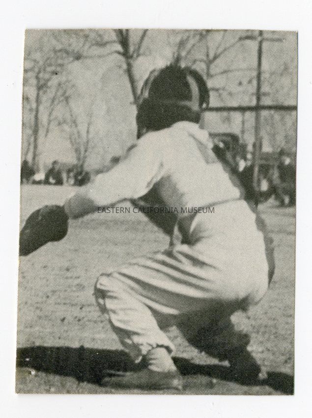 Clipping of a photo of a baseball catcher.