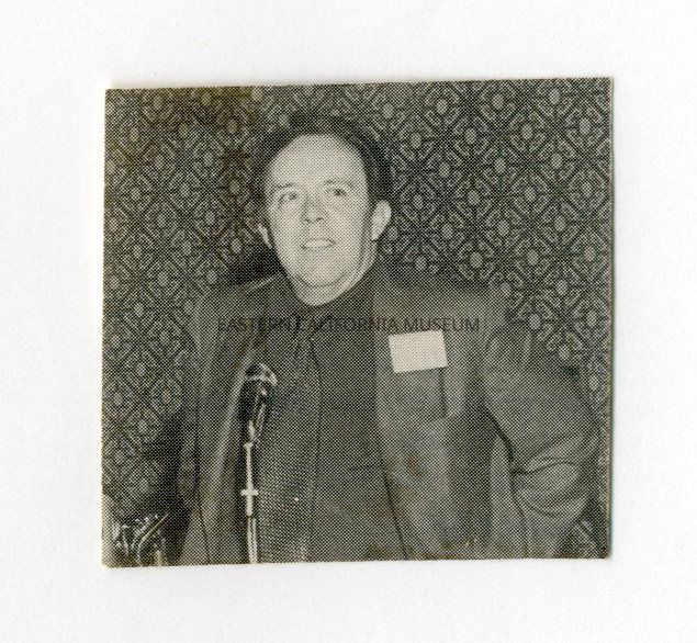 Clipping of a photo of a man speaking at a microphone. A label with this photo says, "Louis Frizzell Jr. Music Teacher."