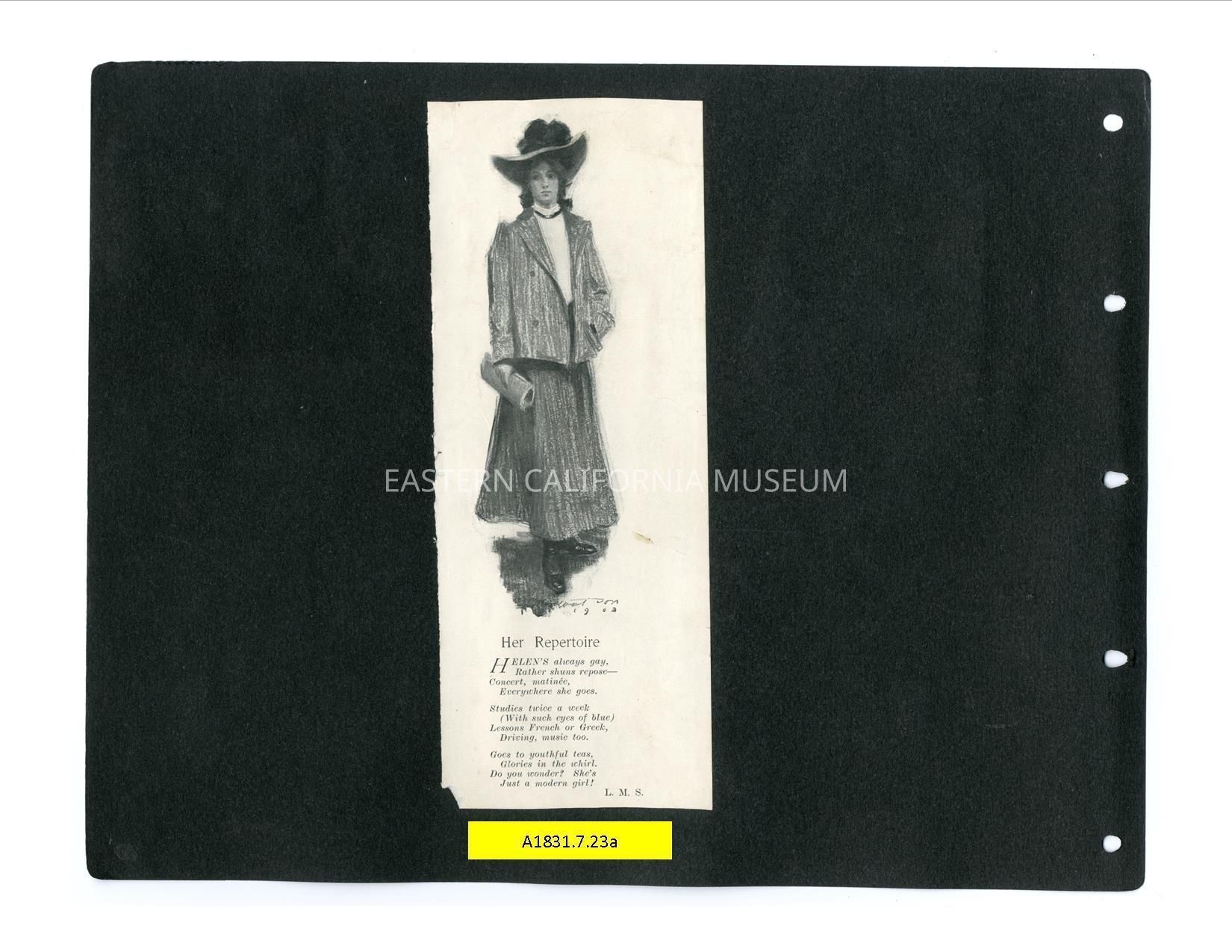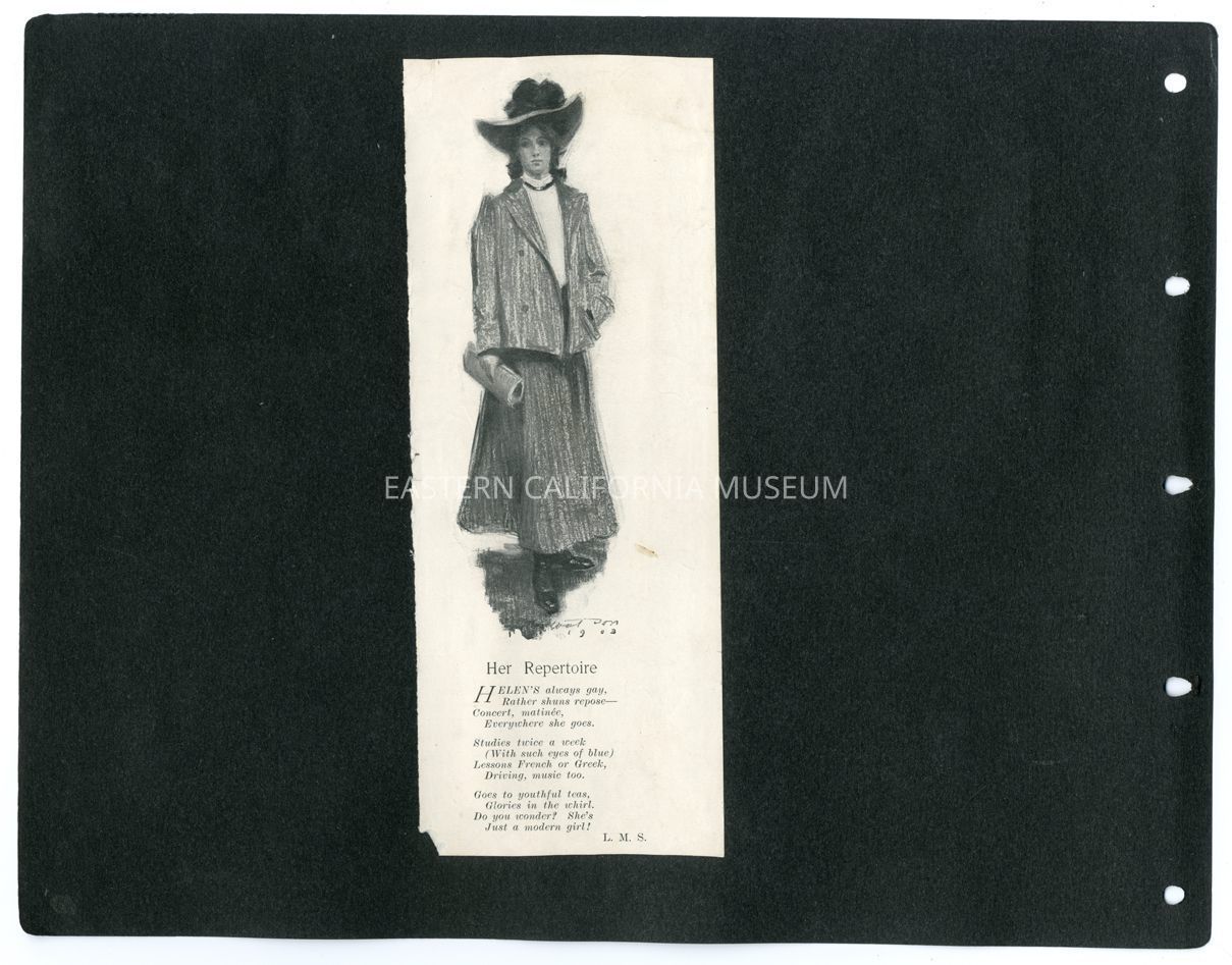 A1831.7.23a: Clipping from a magazine showing a drawing of a woman with a poem titled "Her Repertoire" beneath it.