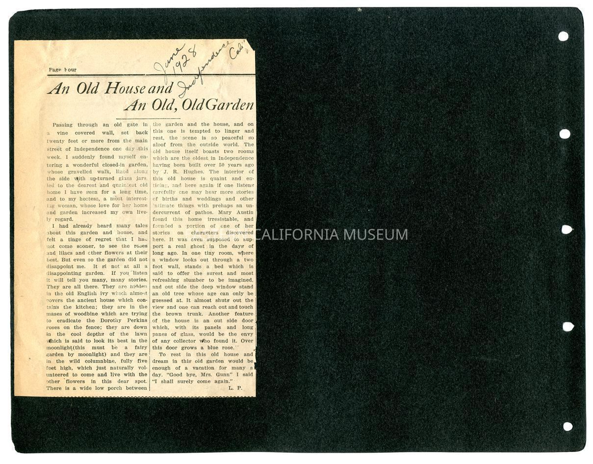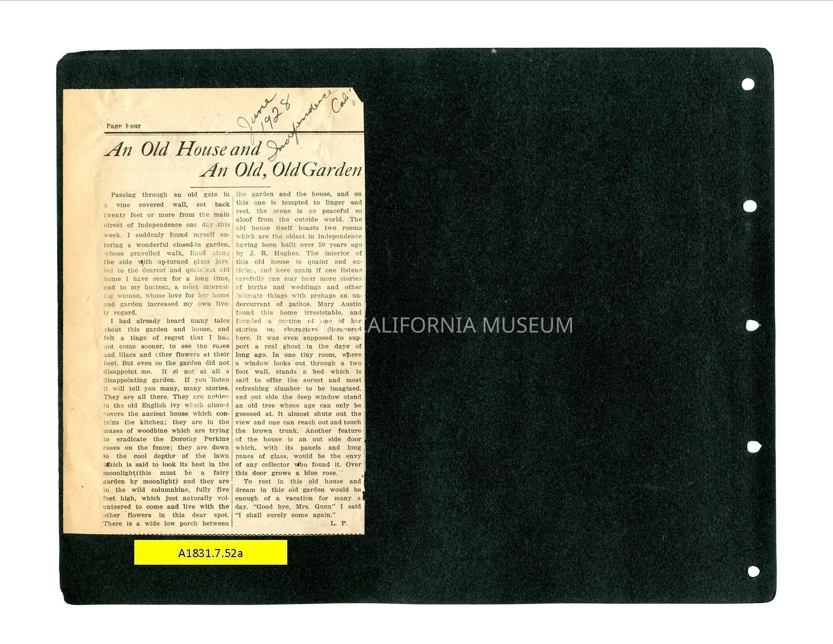 A1831.7.52a: Article clipped from a newspaper titled, "An Old House and An Old, Old Garden." Someone has written June 1928, Independence, Calif." on the page. The author's initials are L. P., and it may be written by Louise Parcher. It is about the Gunn house in Independence.Collection