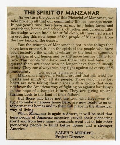 Newspaper clipping affixed to a notecard titled, "The Spirit of Manzanar" written by Ralph P. Merritt, Project Director. The article may have been clipped from the Pictorial Edition of the Manzanar Free Press.Collection