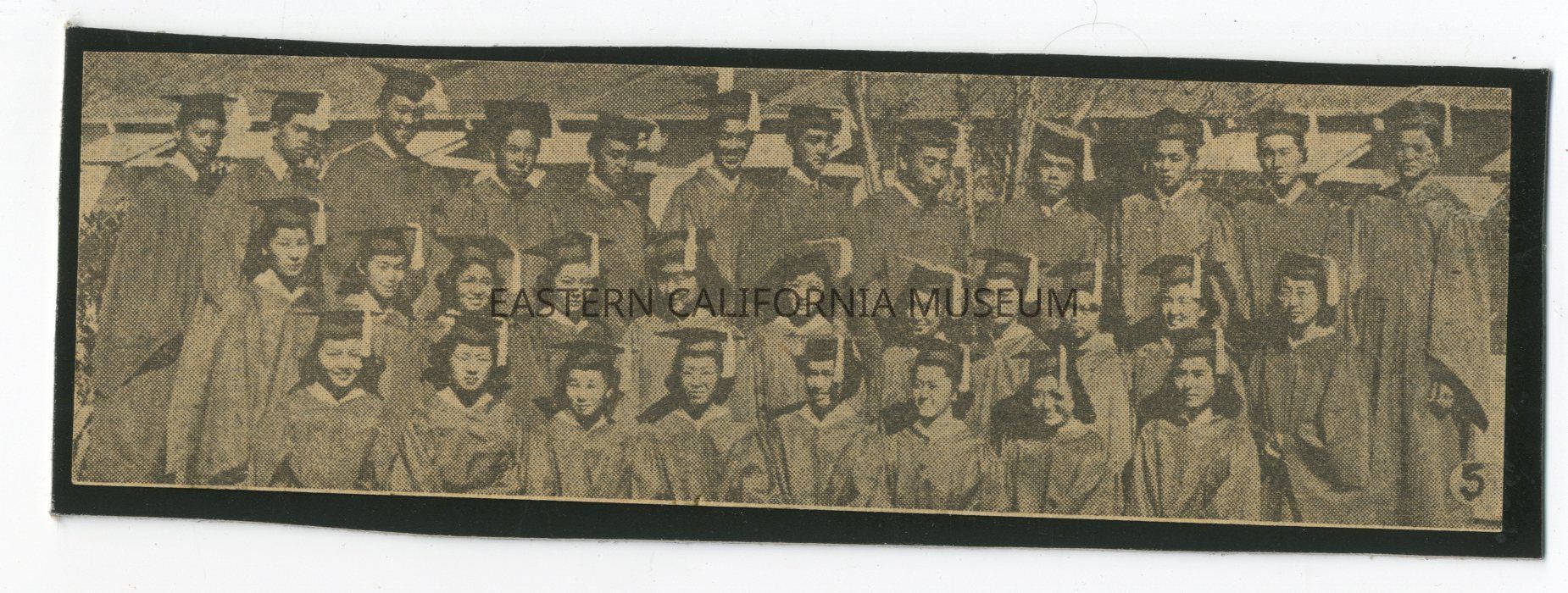 Newspaper clipping of a photo of Manzanar High School graduates. There are approximately 31 students wearing gowns and mortarboards.Collection