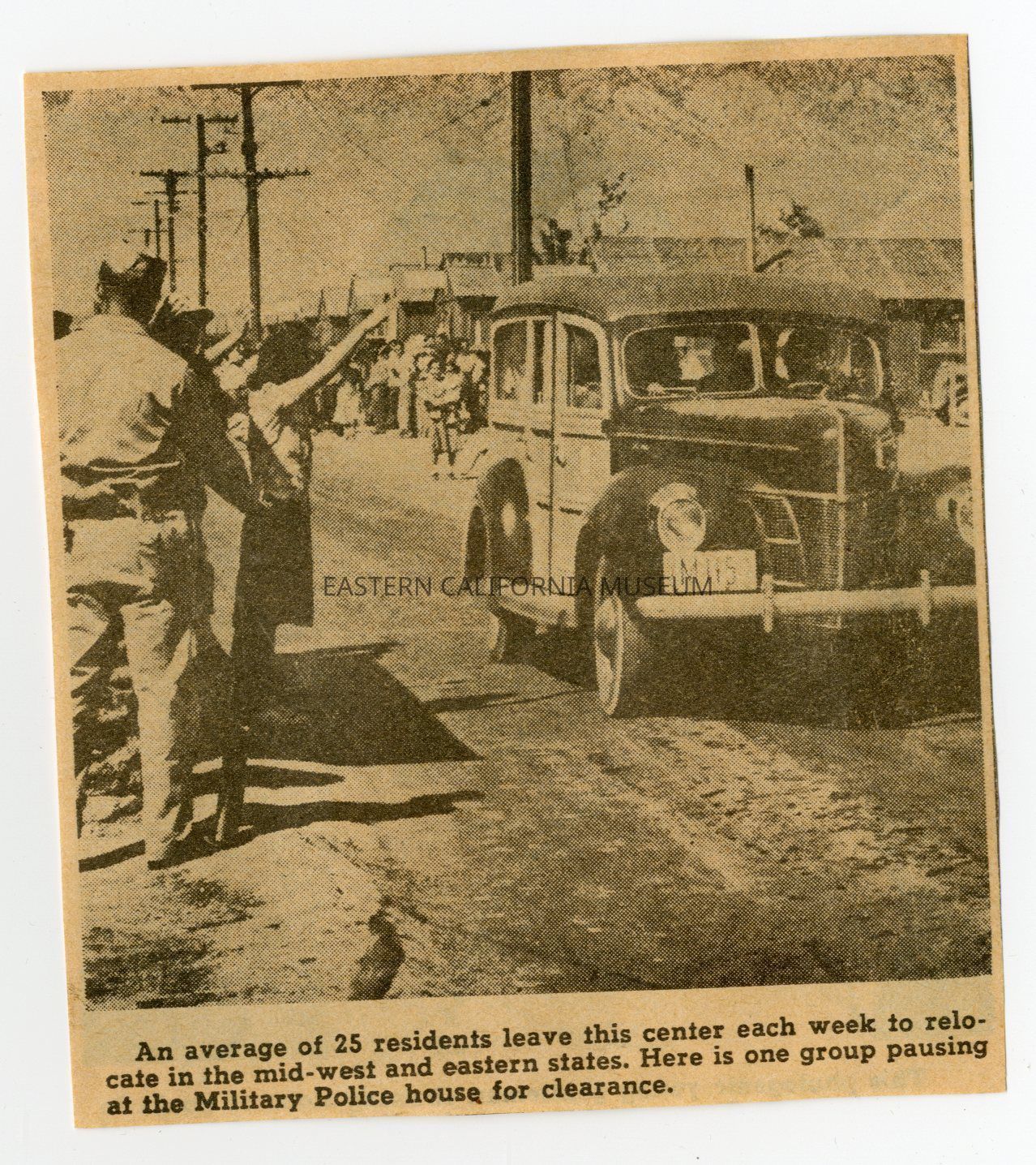 Newspaper clipping of a photo of a woman waving goodbye to a vehicle leaving Manzanar War Relocation Center.