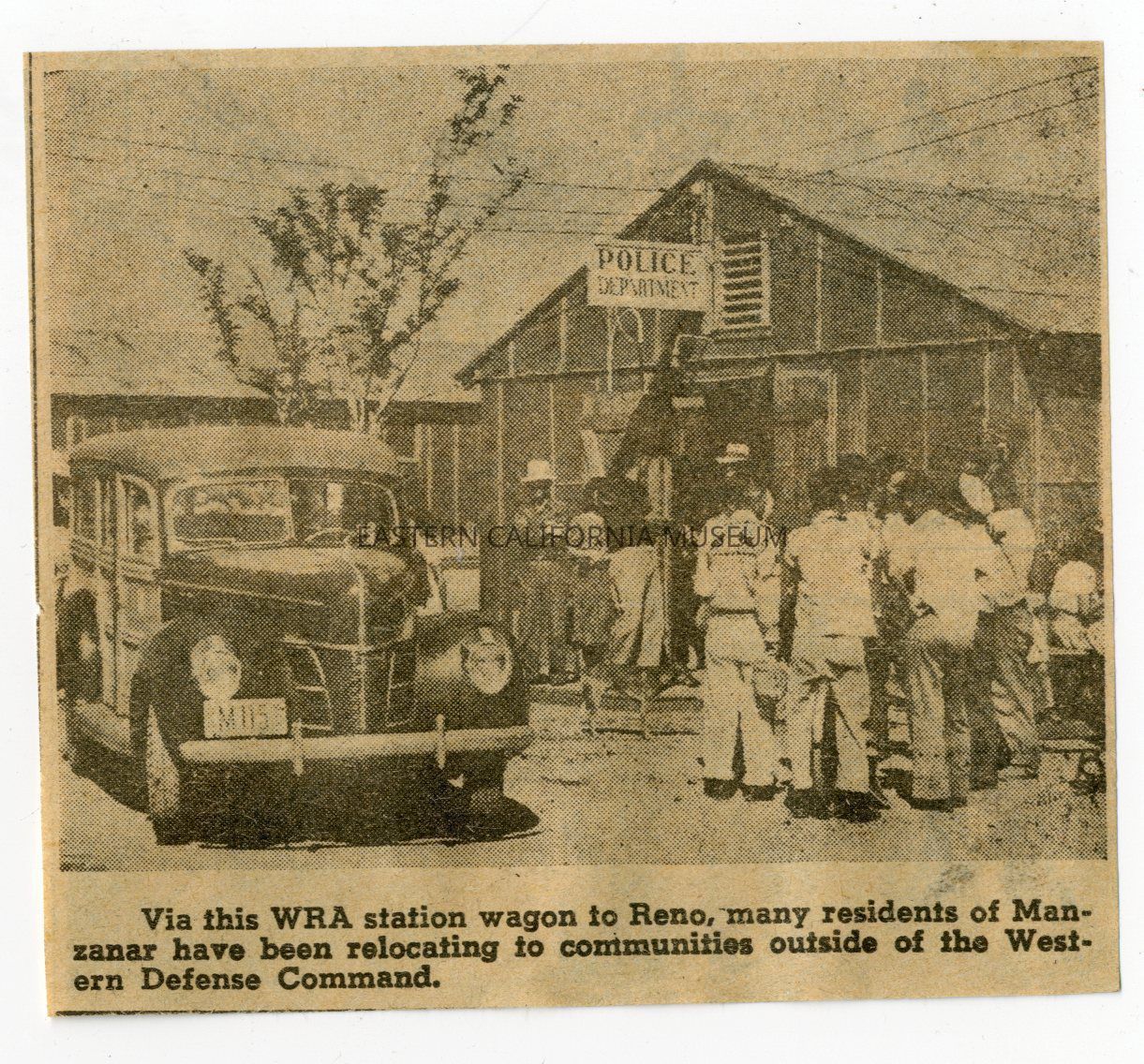 Newspaper clipping of a photo of a vehicle and people in front of the Police Department at Manzanar War Relocation Center.
