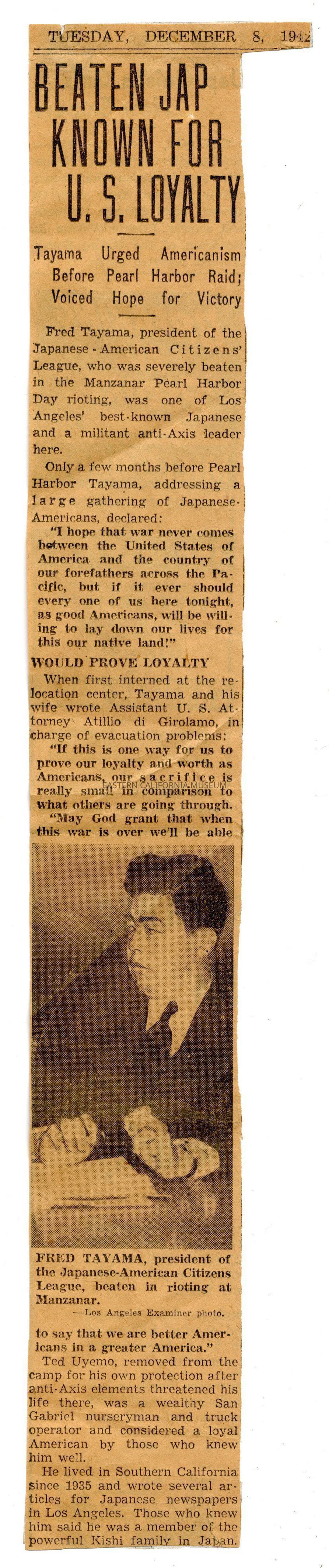 Newspaper clipping from December 8, 1942 titled, "Beaten Jap Known for U.S. Loyalty." It contains a photo of Fred Tayama and an account of the Manzanar Riot.Collection