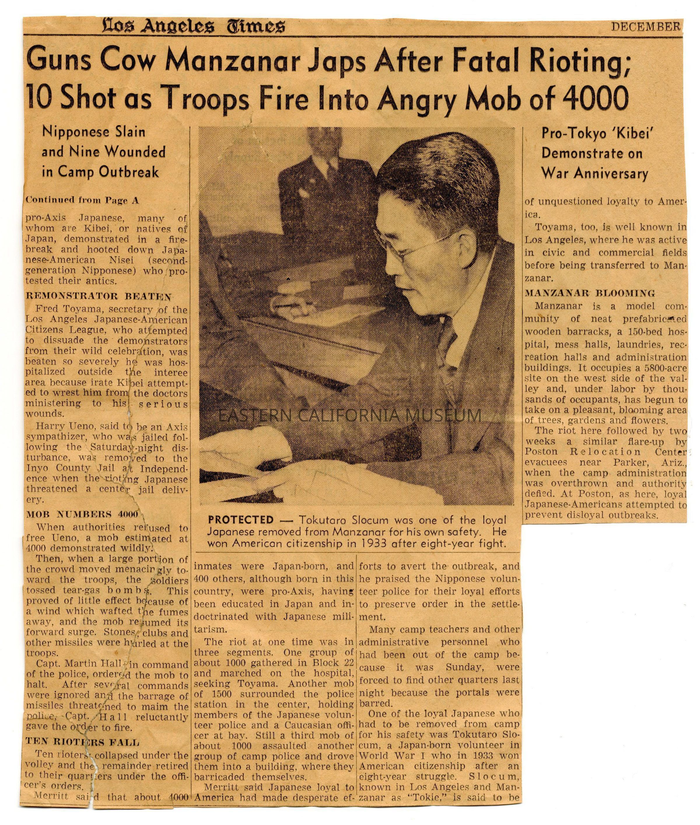 Newspaper clipping from the Los Angeles Times titled, "Guns Cow Manzanar Japs After Fatal Rioting; 10 Shot as Troops Fire Into Angry Mob of 4,000." It contains a photo of Tokutaro Slocum and is an account of the Manzanar Riot.Collection
