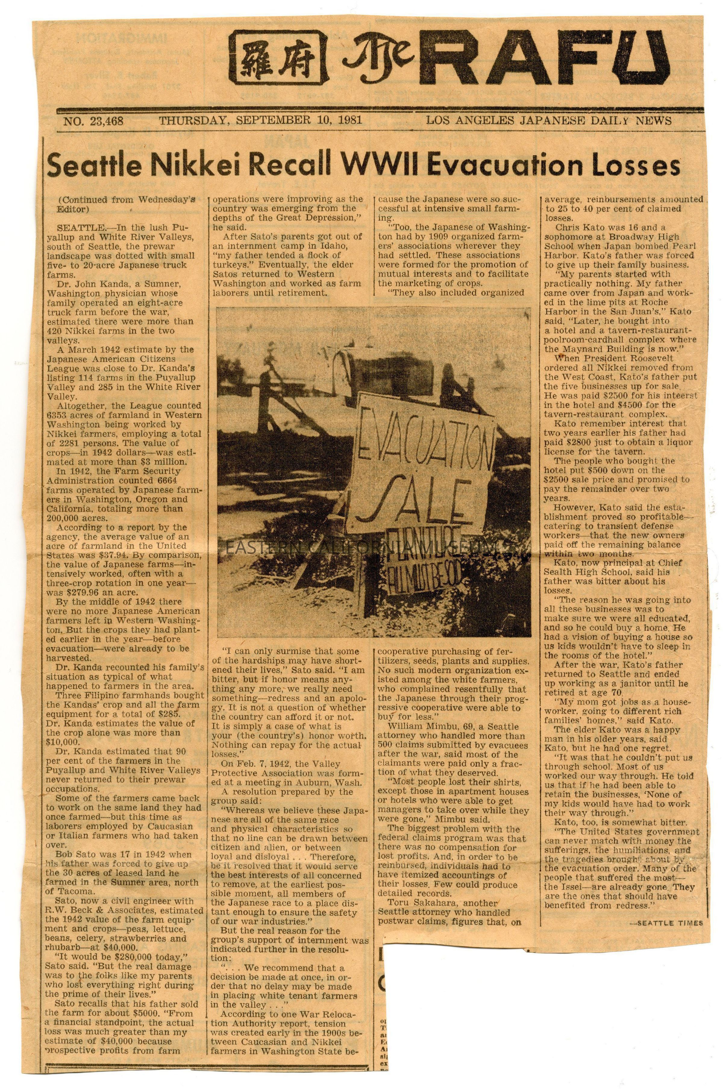 Newspaper clipping from the Rafu dated 09/10/1981 titled, "Seattle Nikkei Recall WWII Evacuation Losses." It contains a photo of a sign that says "Evacuation sale, furniture all must be sold."Collection