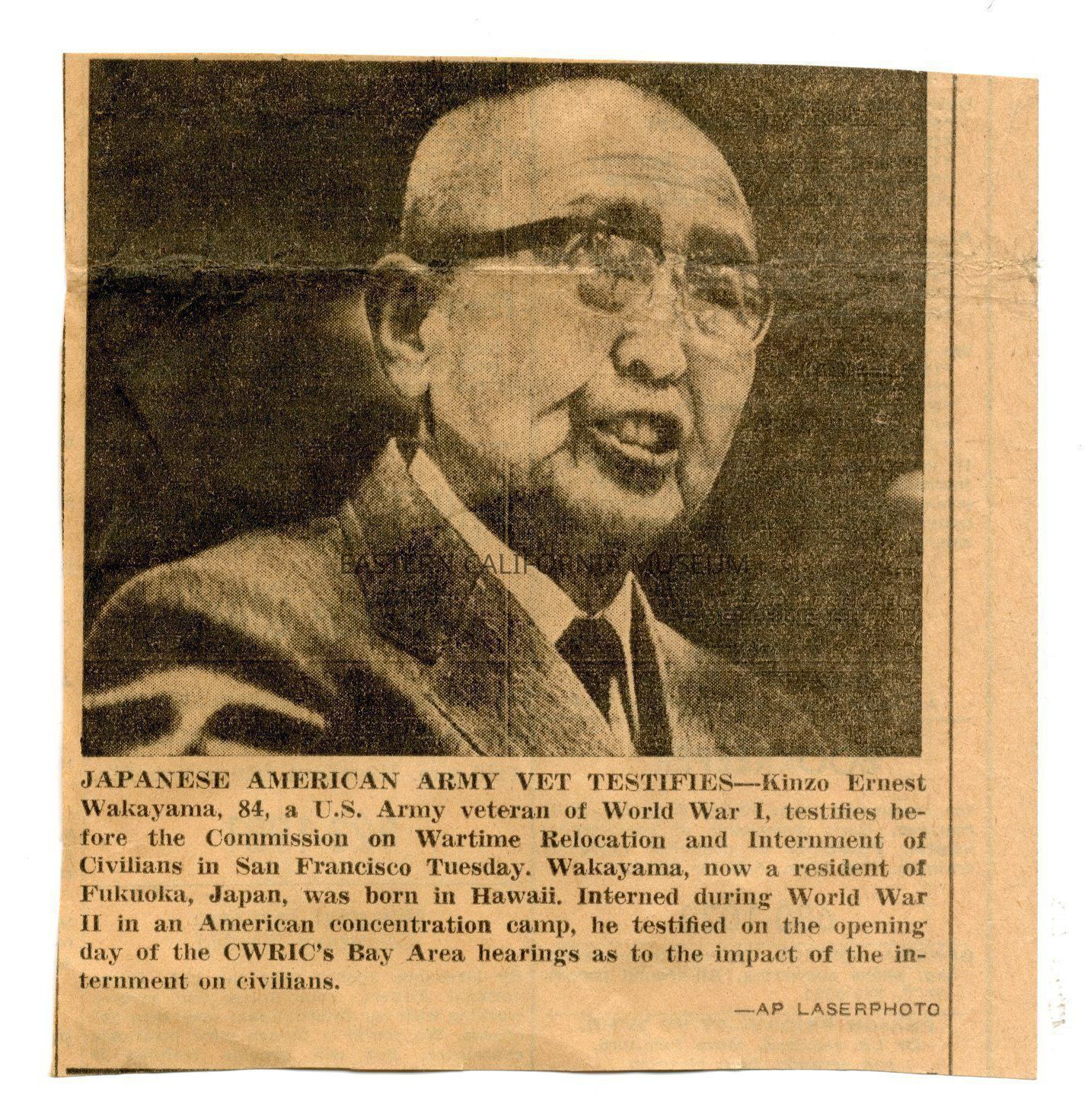 Caption: Japanese American Army Vet Testifies. Kinzo Ernest Wakayama, 84, a U.S. Army veteran of World War I, testifies before the Commission on Wartime Relocation and Internment of Civilians in San Francisco Tuesday. Wakayama, now a resident of Fukuoka, Japan, was born in Hawaii. Interned during World War II in an American concentration camp, he testified on the opening day of the CWRIC's Bay Area hearings as to the impact of the internment on civilians.Collection