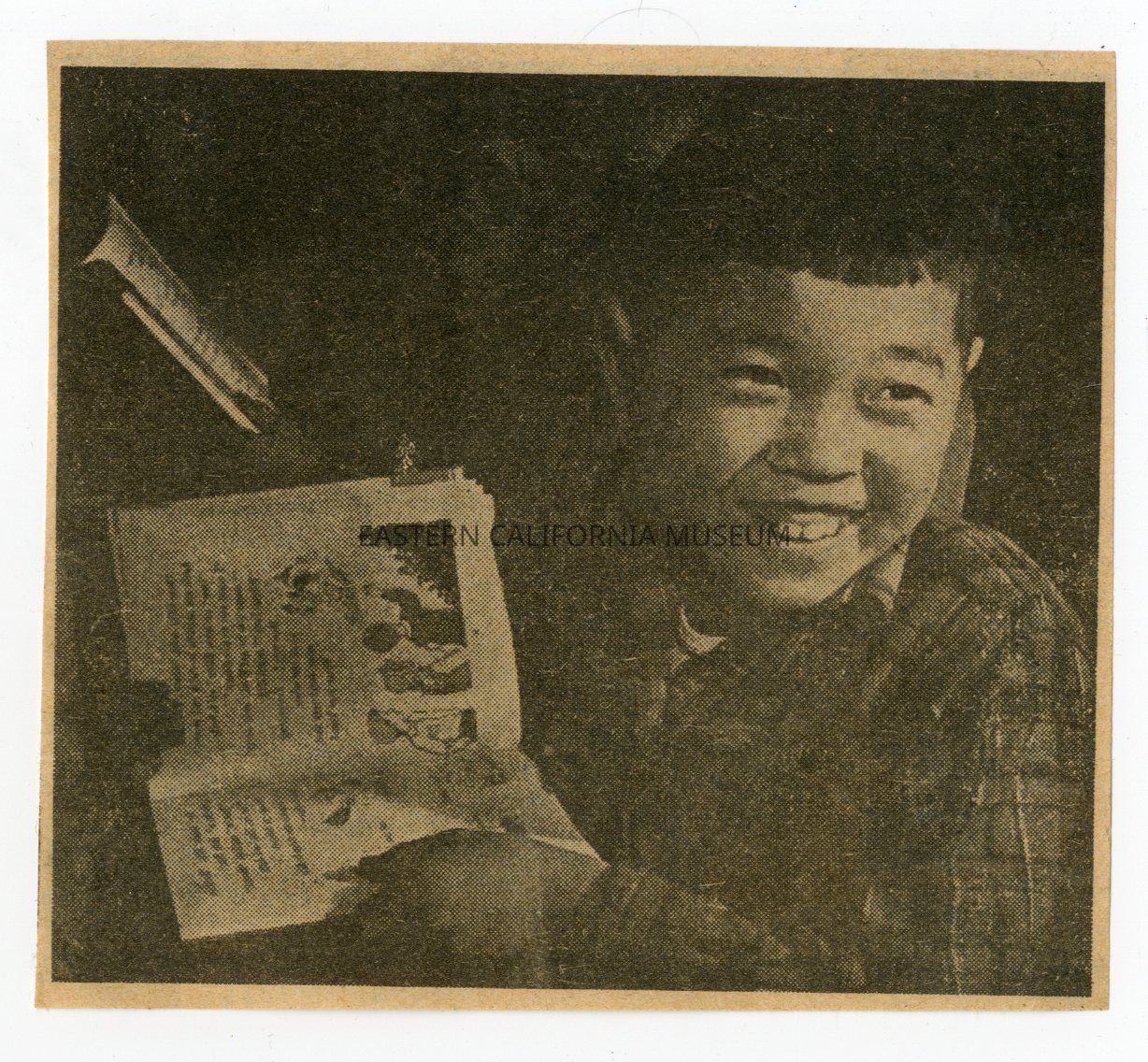 Newspaper clipping of a photo of a young boy smiling and holding an early reader book.