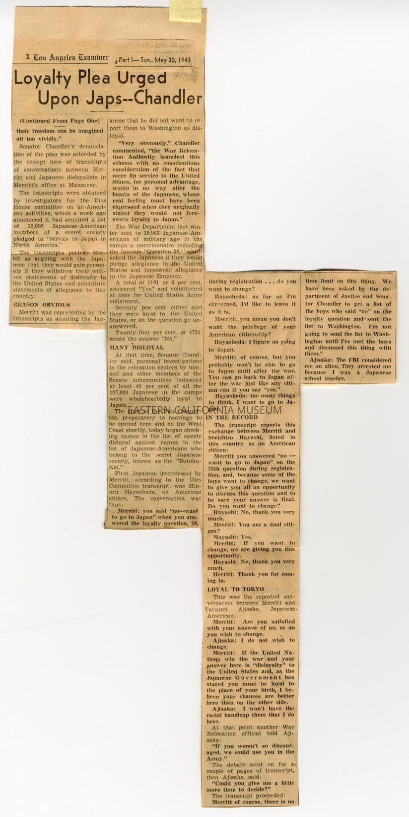 Continuation of the newspaper clipping written by Ray Richards with the headline, "Loyalty Plea Urged Upon Japs--Chandler." It was published in the Los Angeles Examiner on May 30, 1943.Collection