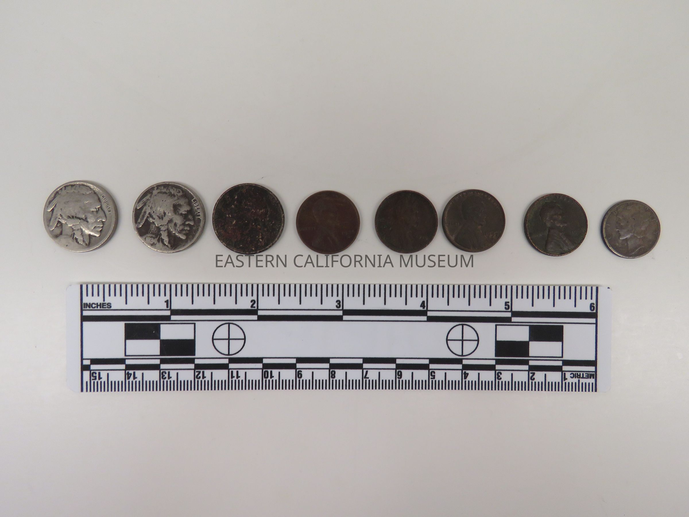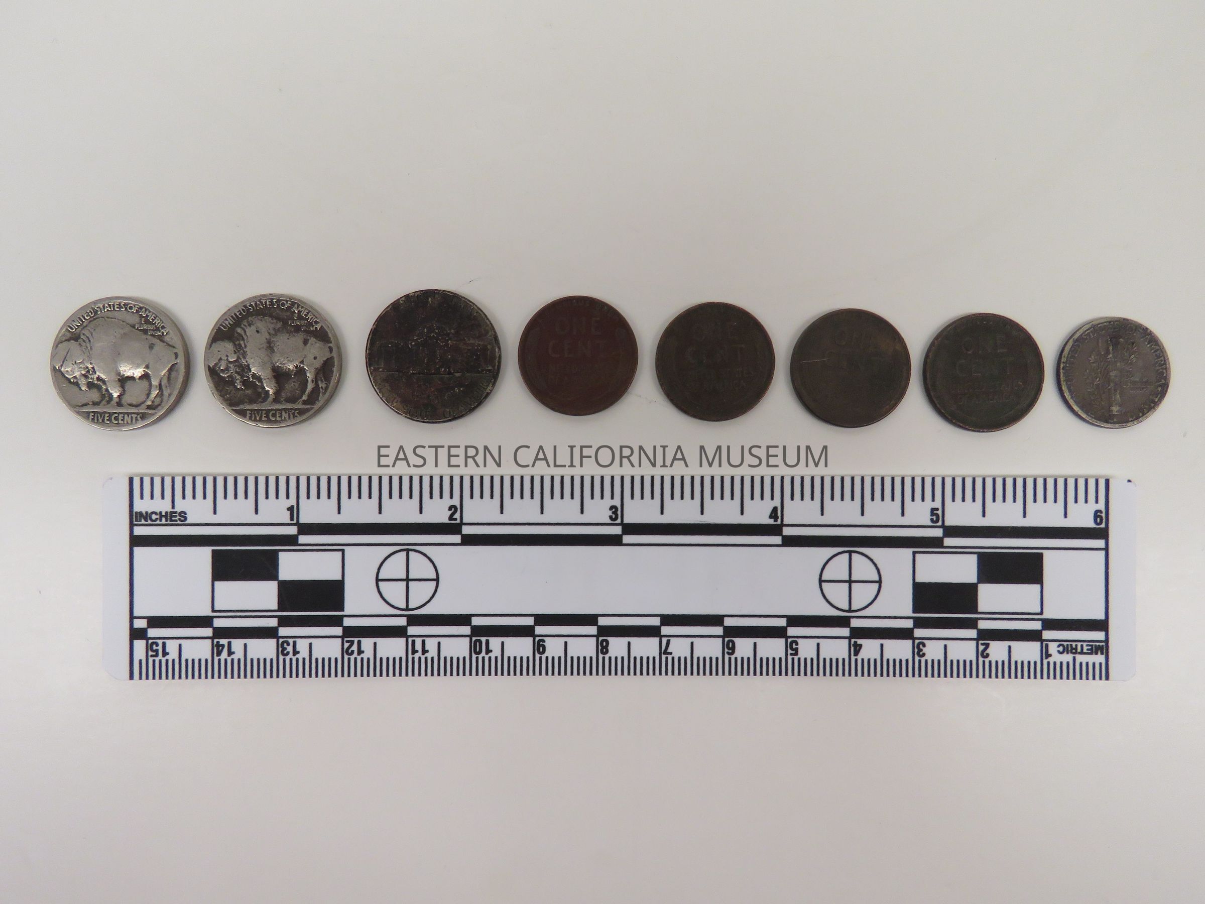 Collection of 8 coins that may have been found at the cemetery monument at Manzanar War Relocation Center.