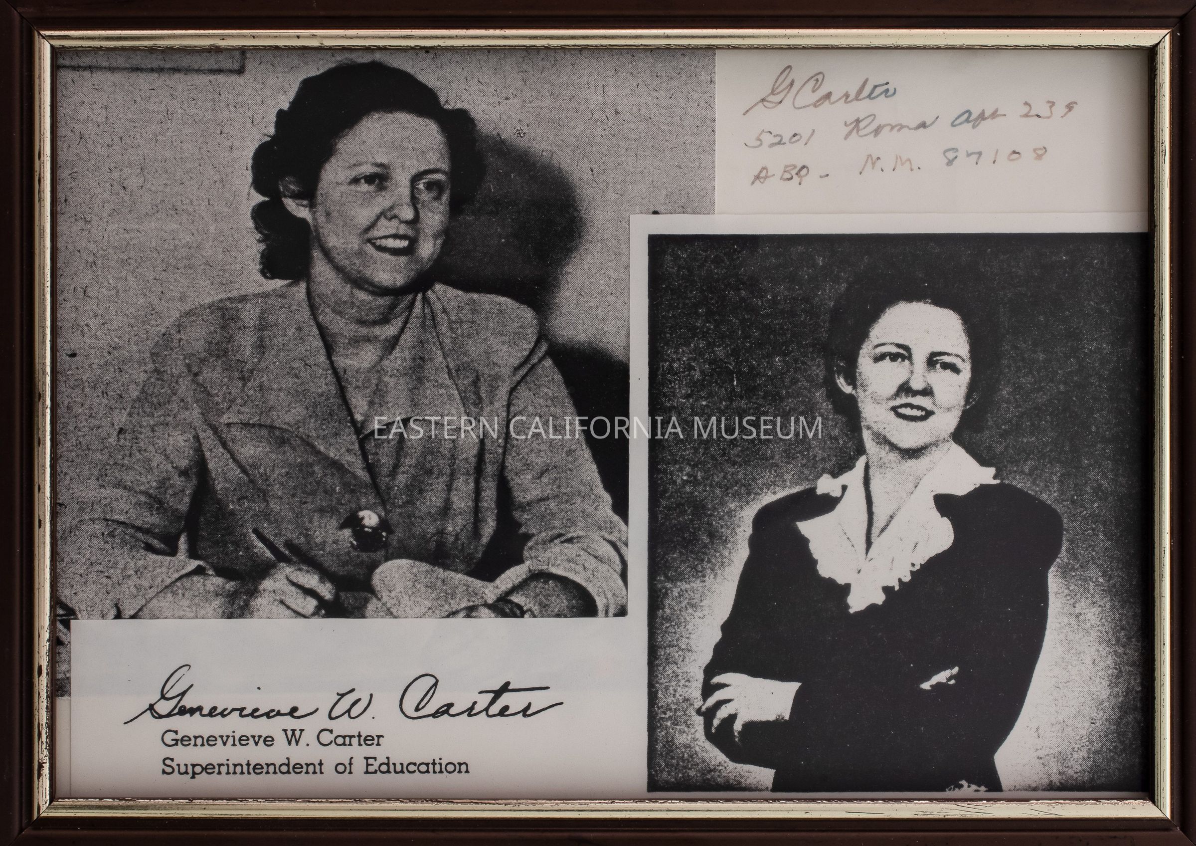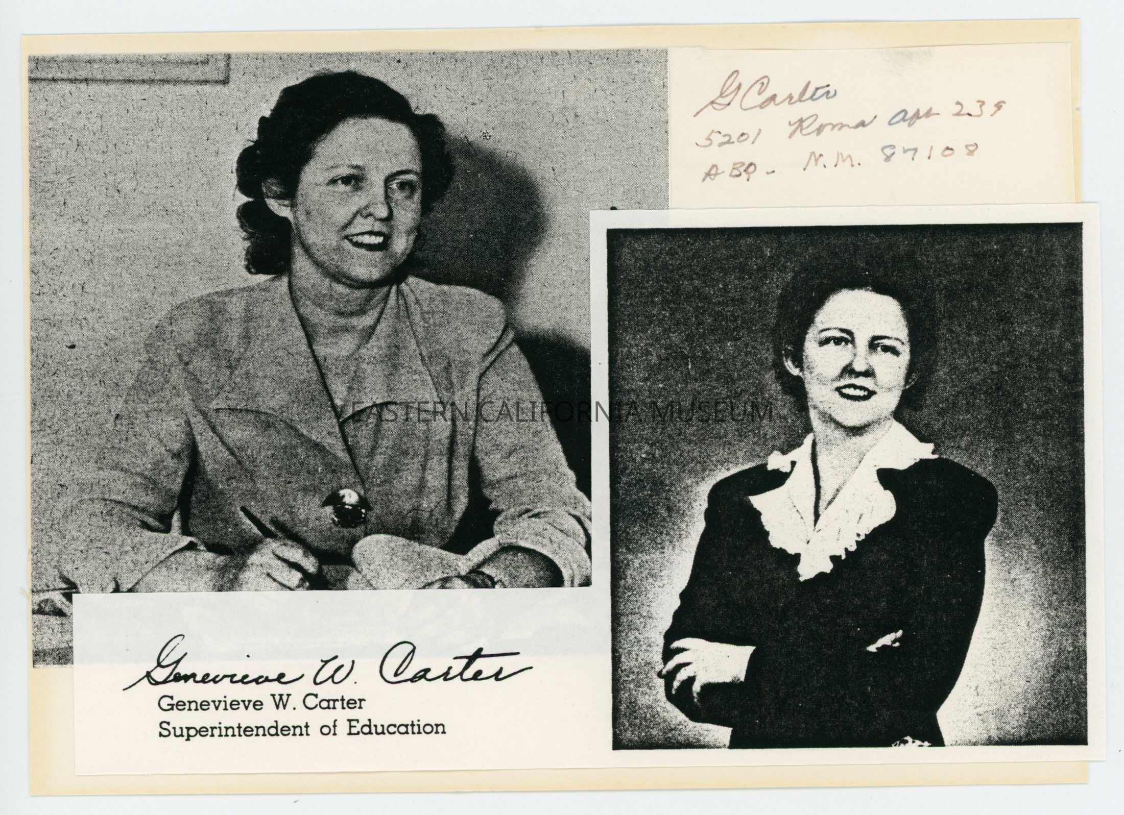 Collage consisting of two photocopied photos of Dr. Genevieve W. Carter, Superintendent of Education at Manzanar War Relocation Center and a handwritten address. One of the photos has a copy of her signature, name, and job title.Collection