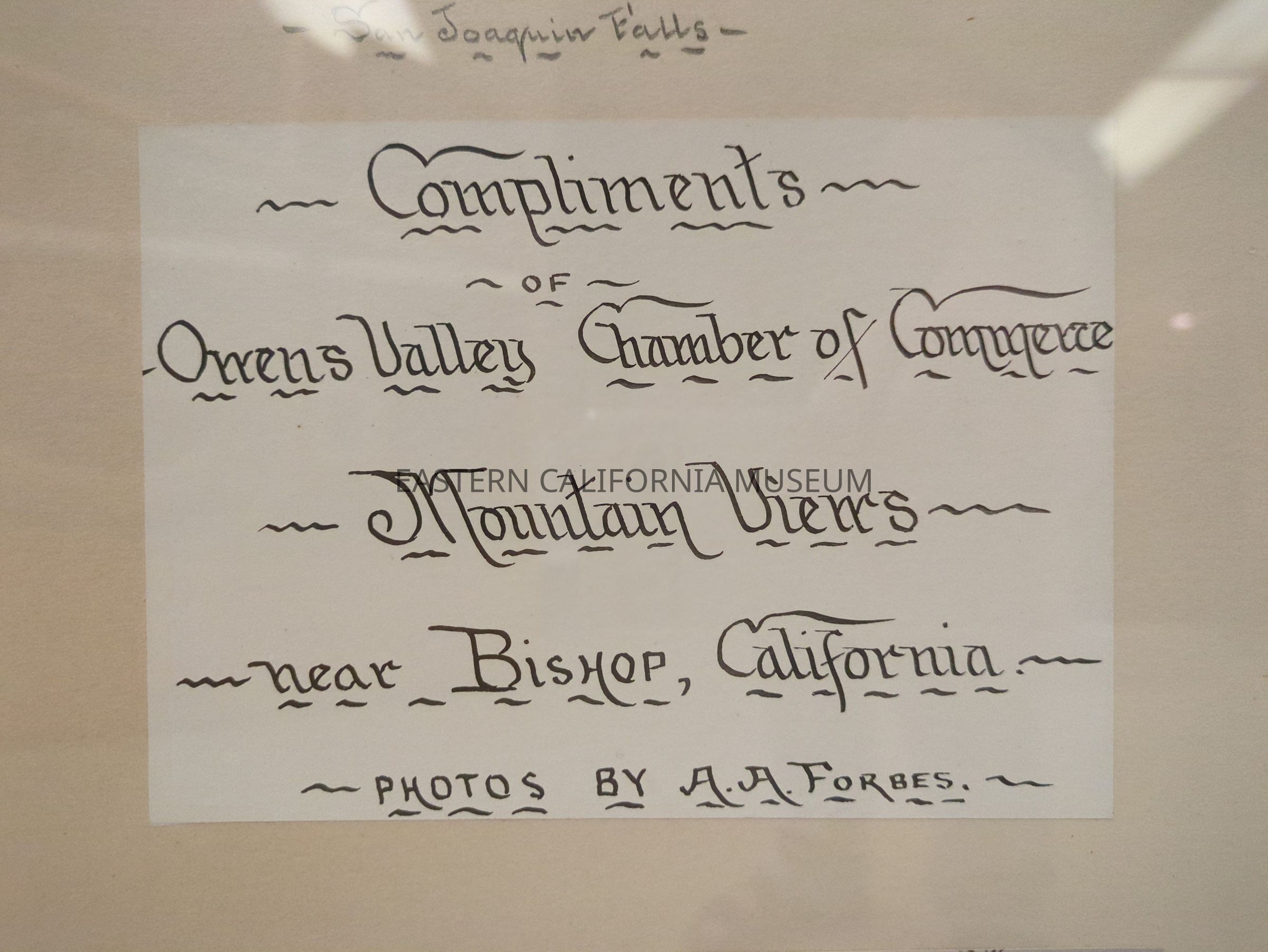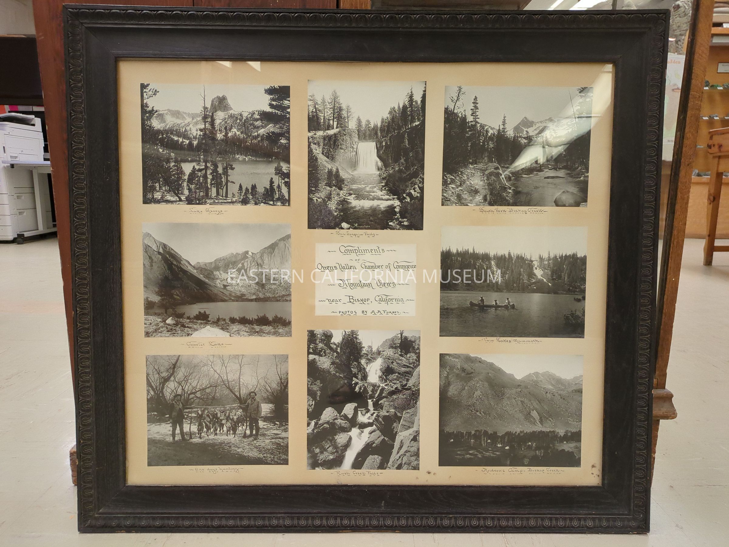 Large glass covered picture frame containing eight photos of "Mountain Views near Bishop, California." They are mostly of the Mammoth area. Each photo is hand-labeled, and they include "Lake George," "San Joaquin Falls," "South Fork Bishop Creek," "Convict Lake," "Twin Lakes Mammoth," "One Day's Hunting," "Rush Creek Falls," and "Andrew's Camp, Bishop Creek." It was made by the Owens Valley Chamber of Commerce, but who it was made for and where it was displayed is unknown.