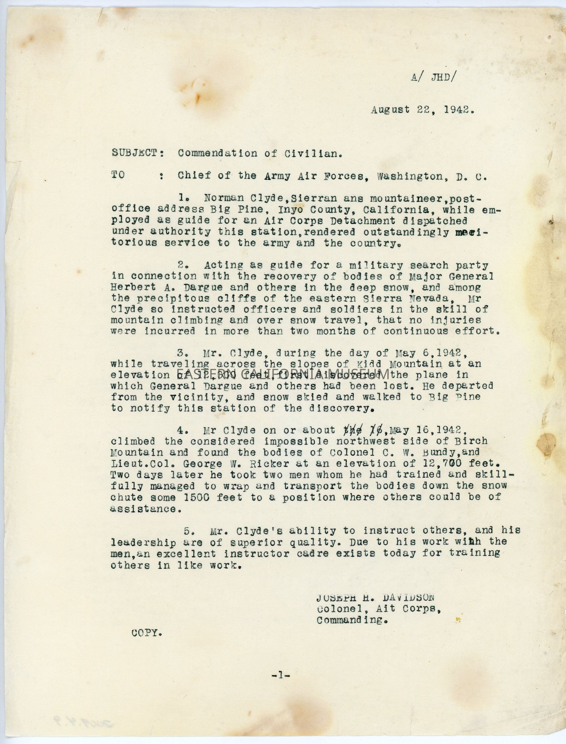 Copy of one typewritten page titled, "Commendation of Civilian" dated 08/22/1942, written by Joseph Davidson, Colonel, Air Corps, Commanding, to Chief of the Army Air Forces, Washington, D.C.