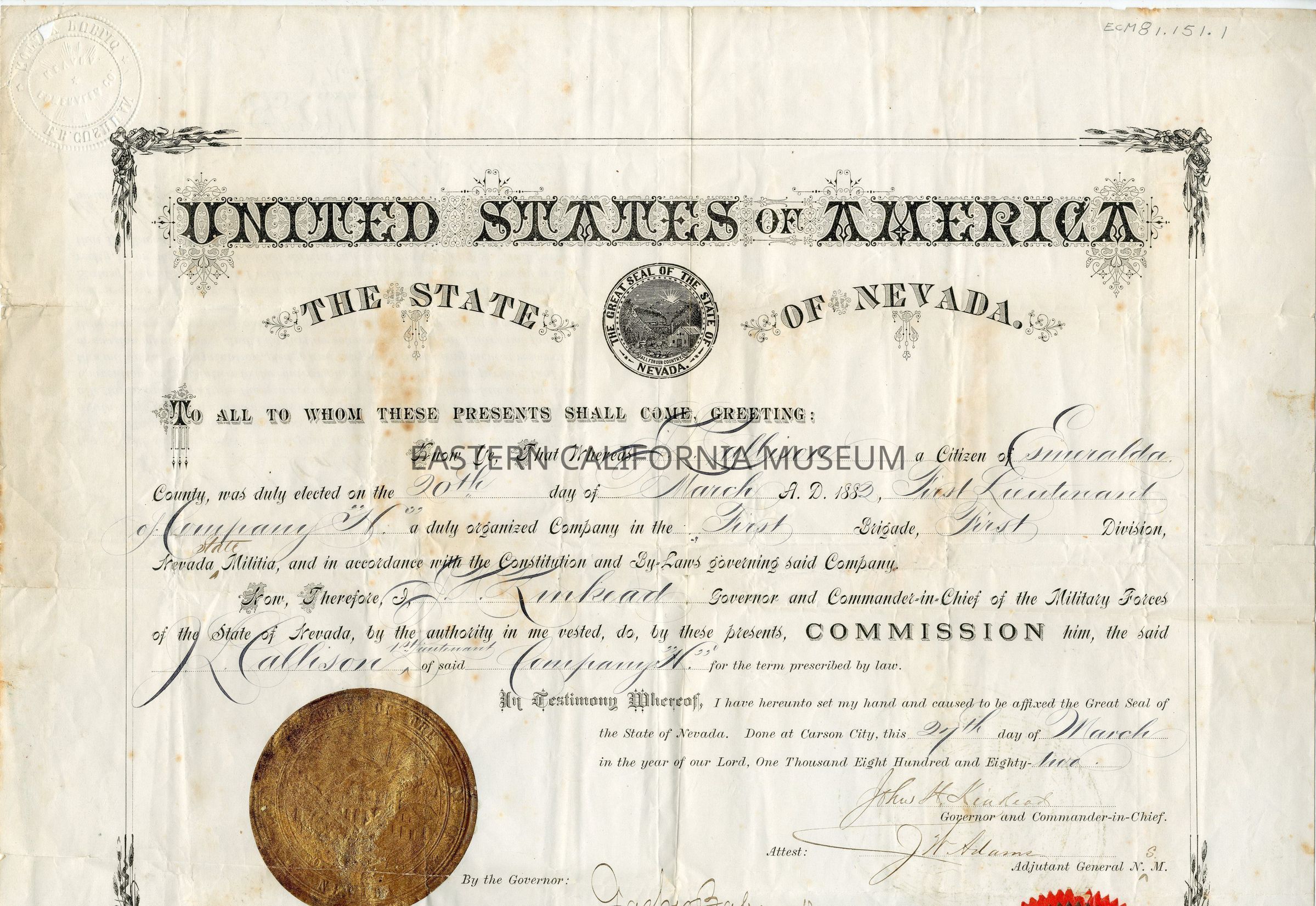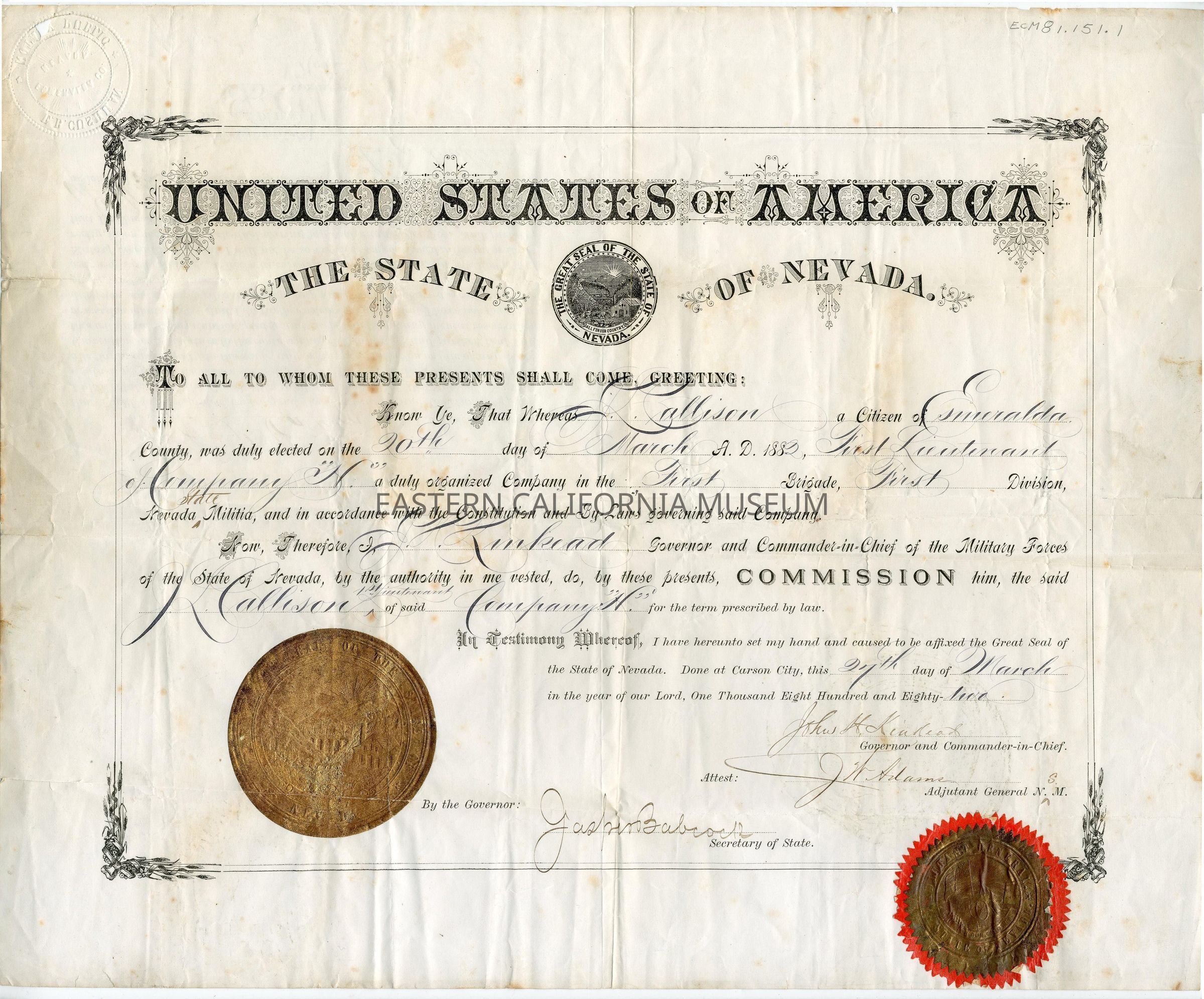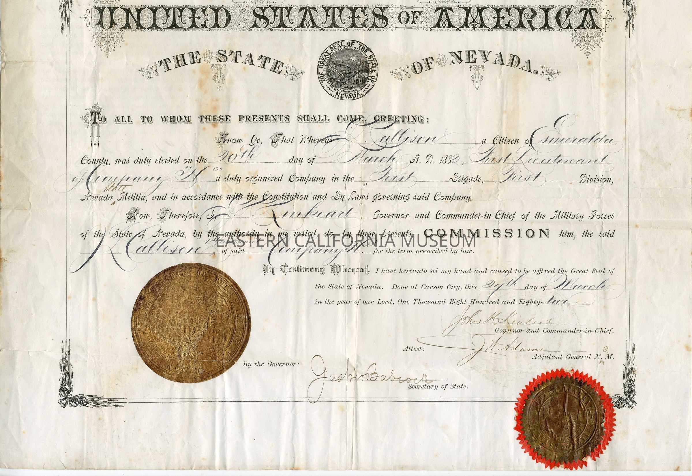 "United States of America the State of Nevada. To all to whom these presents shall come, greeting: Know ye, that whereas J. Callison a citizen of Esmeralda County was duly elected on the 20th day of March A.D. 1882, First Lieutenant of Company "H" a duly organized Company in the FIrst Brigade, First Division, Nevada State Militia, and in accordance with the Constitution and By-Laws governing said Company. Now, therefore I, J. H. Kinkead, Governor and Commander-in-Chief of the Military Forces of the State of Nevada, by the authority in me vested, do, by these presents, Commission him, the said J. L. Callison 1st Lieutenant of said Company "H" for the term prescribed by law. In testimony whereof, I have hereunto set my hand and caused to be affixed the Great Seal of the State of Nevada. Done at Carson City, this 27th day of March in the year of our Lord, One Thousand Eight Hundred and Eighty-Two."