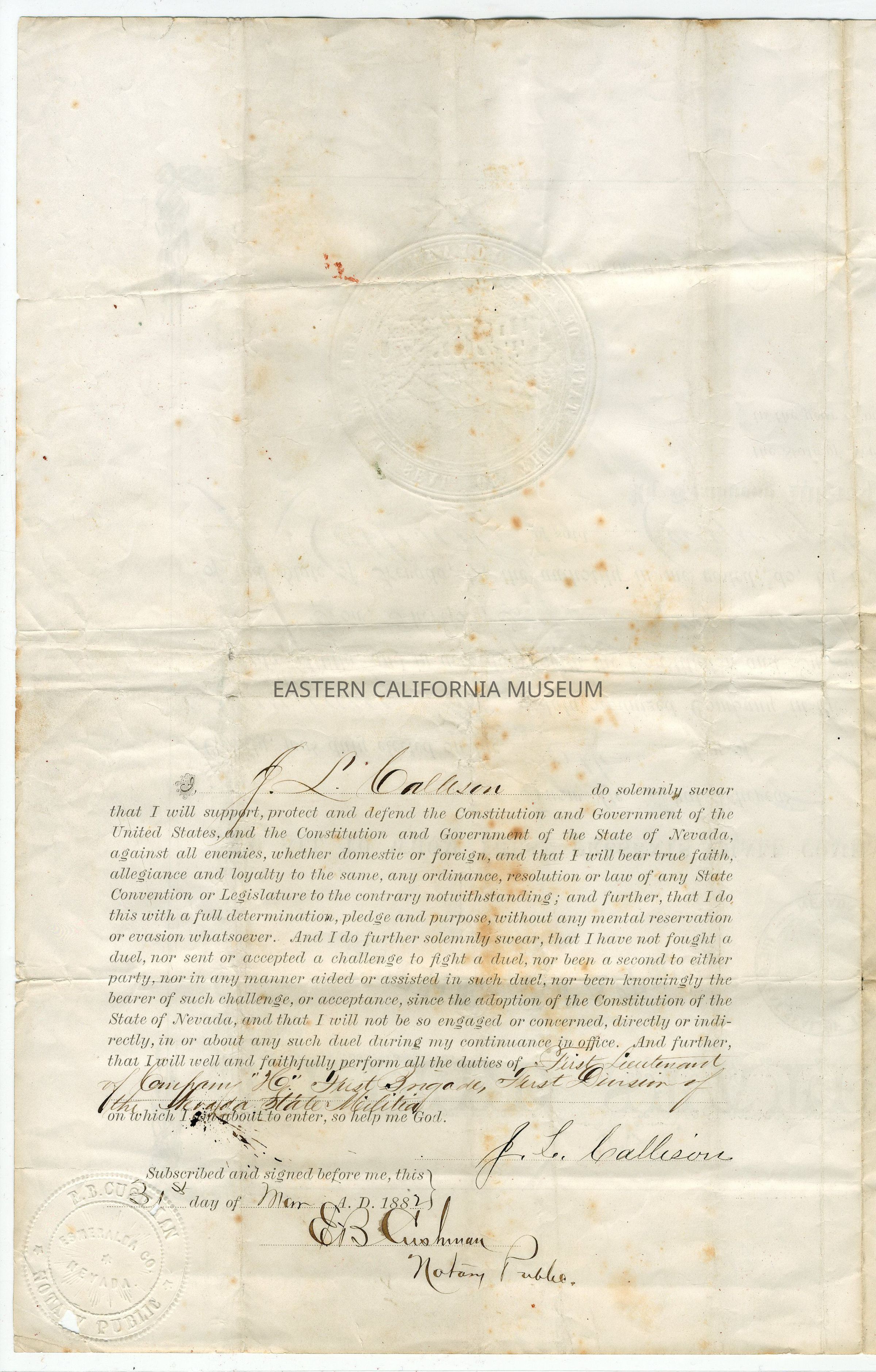Commission document for J. L. Callison, March 1882. It is signed by John. H. Kinkead, Governor and Commander-in-Chief of the military forces of the state of Nevada, J. W. Adams, Adjutant General of the Nevada State Militia, and Jasper Babcock, Secretary of State. It is signed on the back by J. L. Callison and E. B. Cushman, Notary Public.