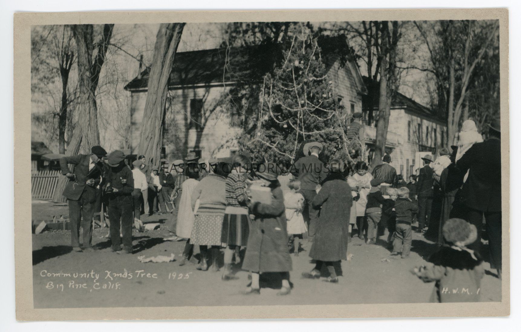 Photo postcard titled, "Community Xmas Tree, 1925, Big Pine, Calif." taken by photographer H. W. Mendenhall and given his ID #1. It shows a decorated Christmas tree at the corner of Main and Crocker Streets, with what might be the Butler Hotel in the background. There are all sorts of people milling around, and from the wrapping paper on the ground it looks like they have been opening presents.Photograph Details