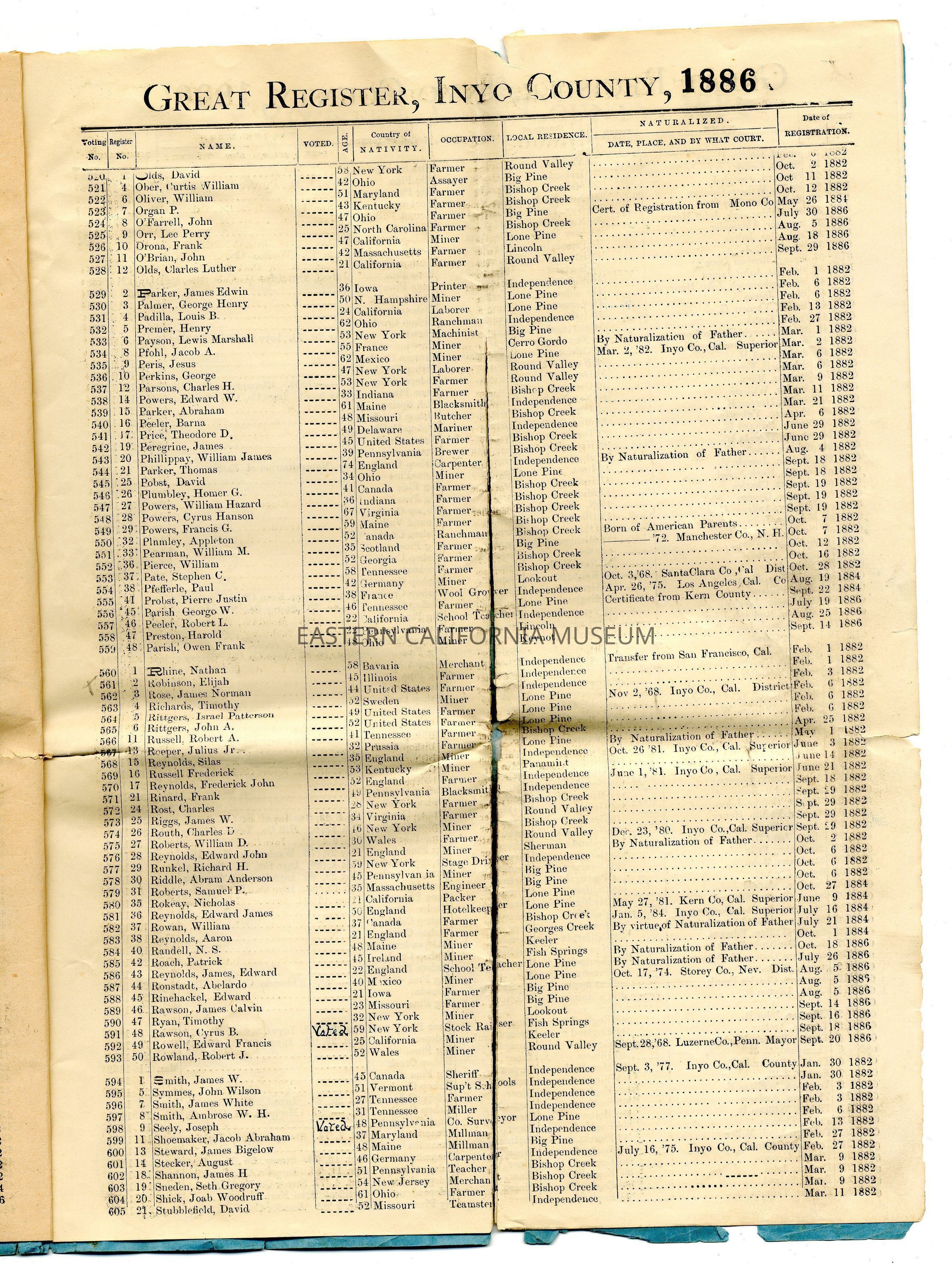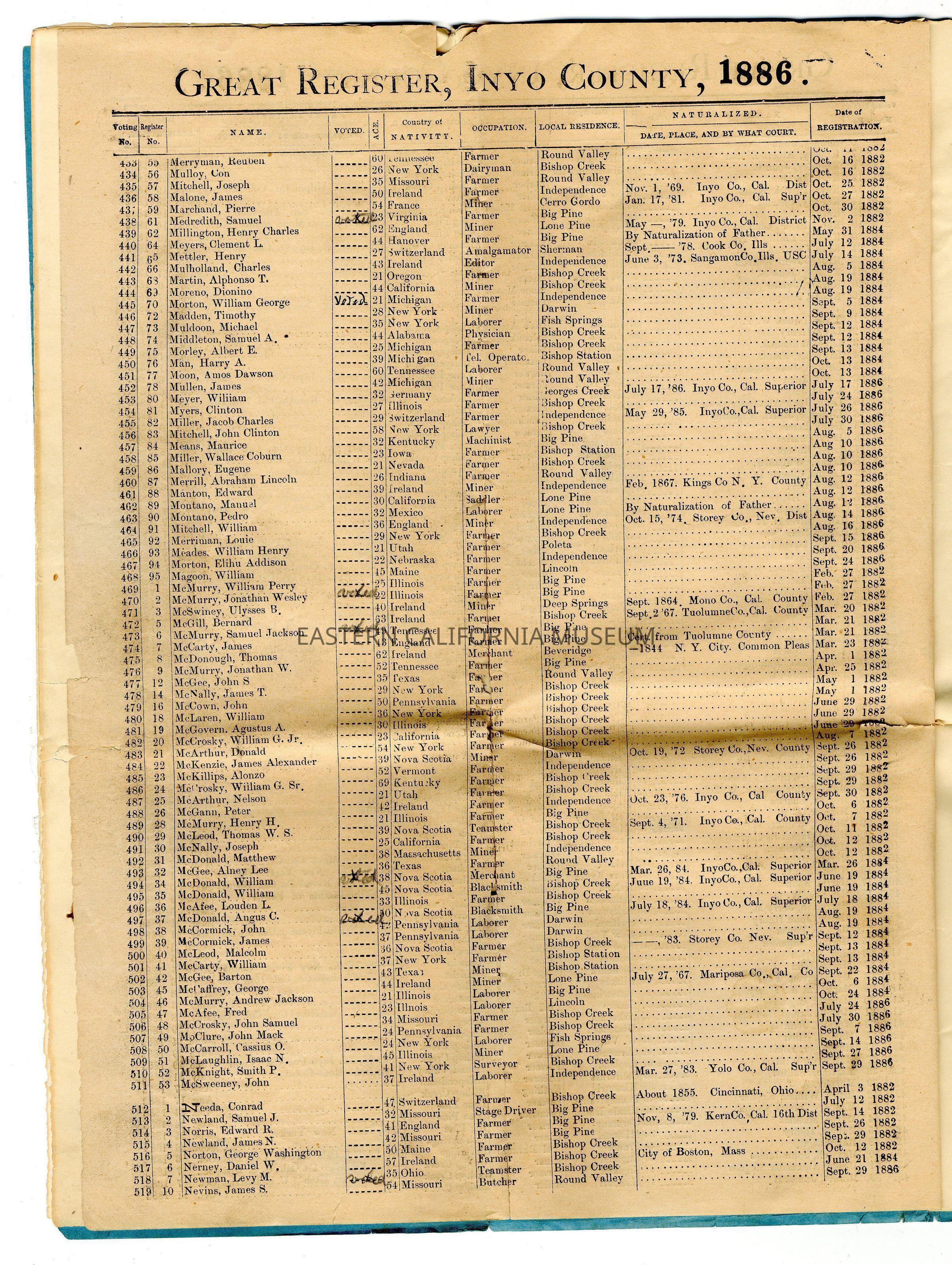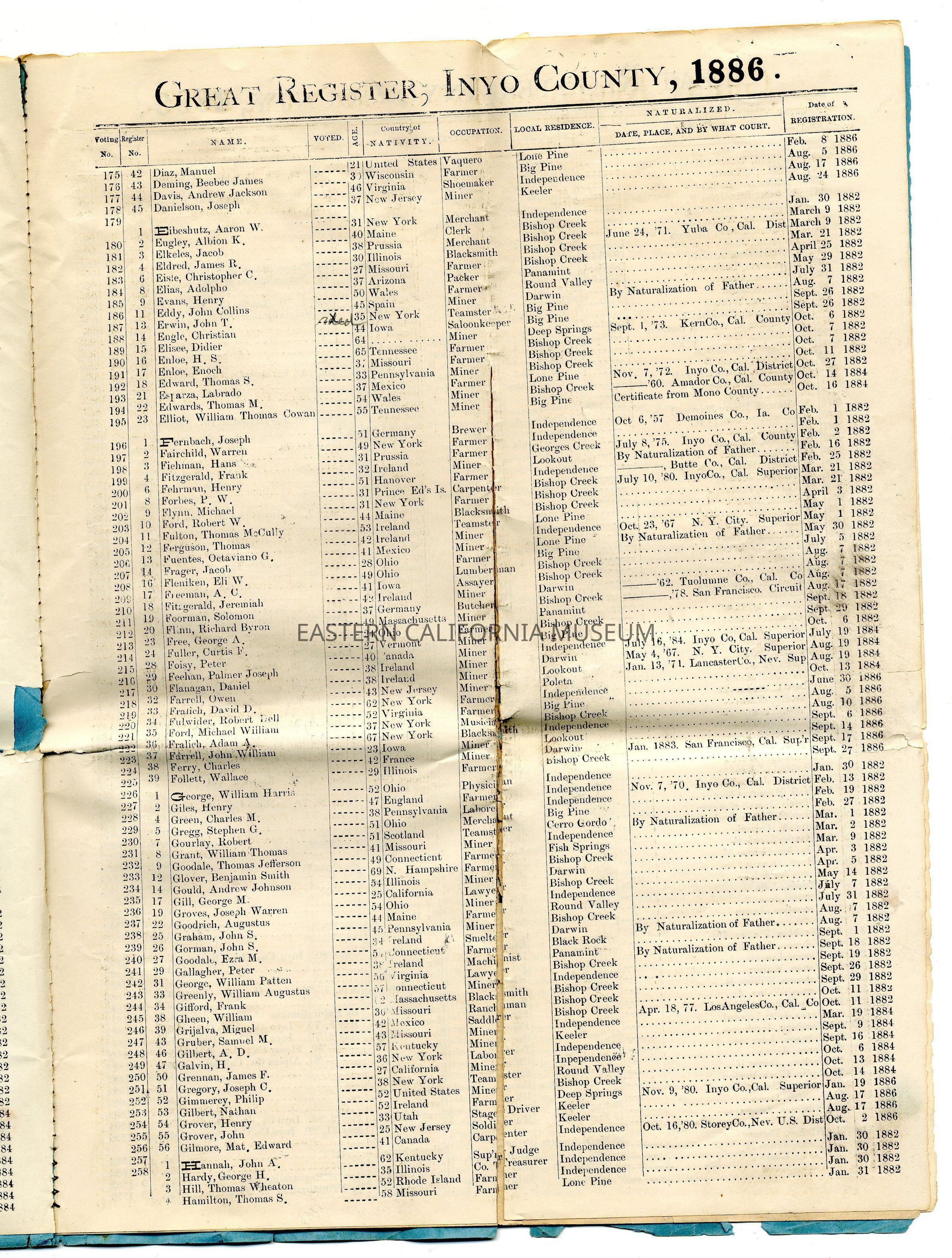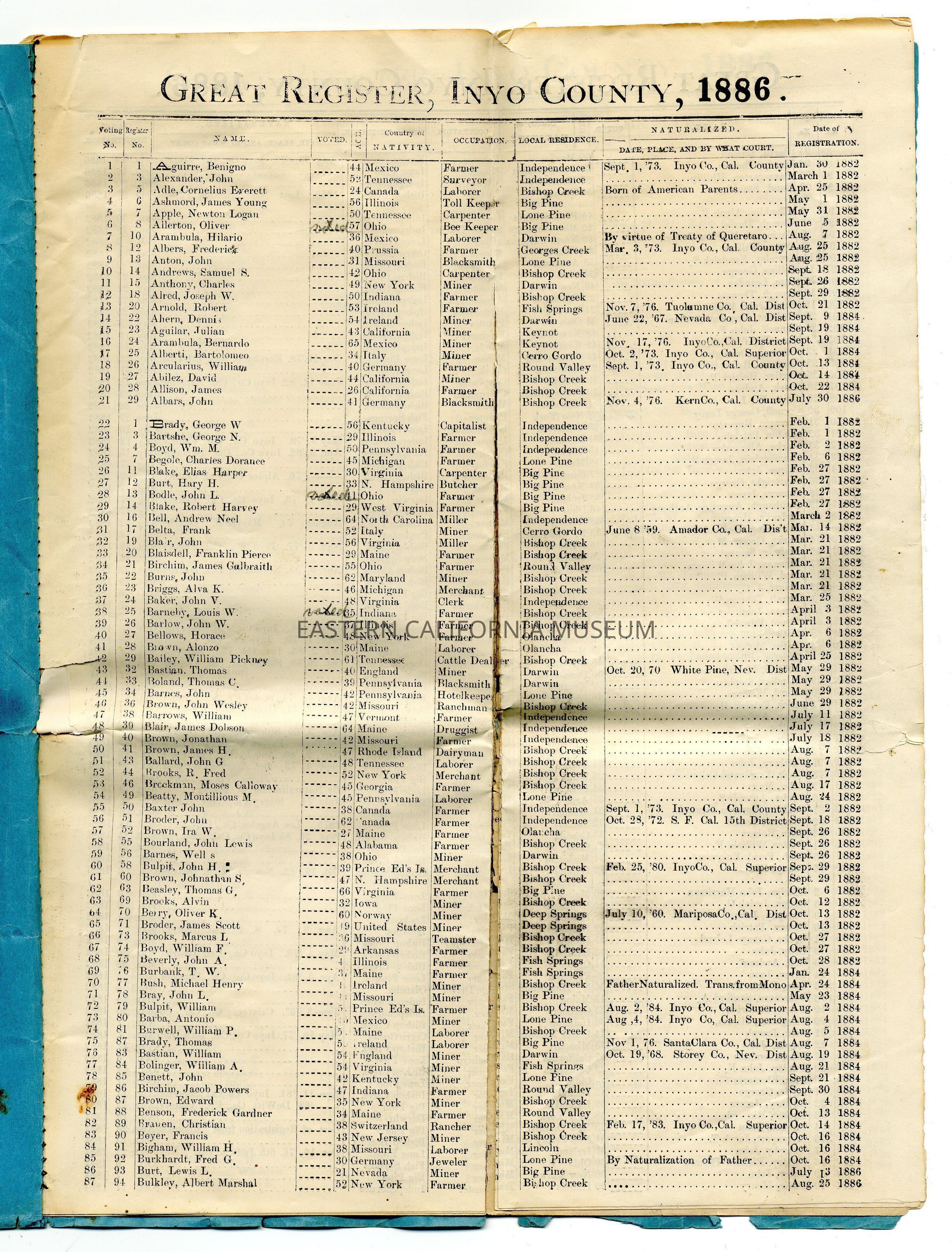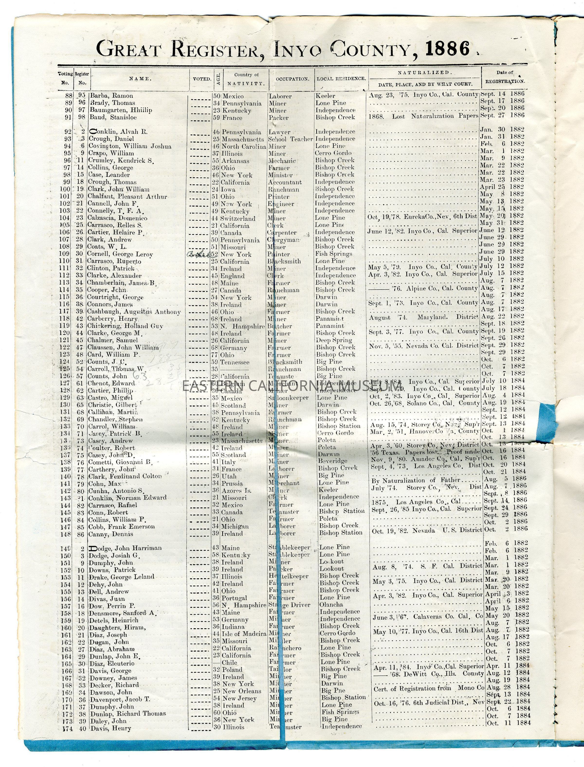 Copy of the Great Register of Inyo County, California, 1886Entry/Object ID