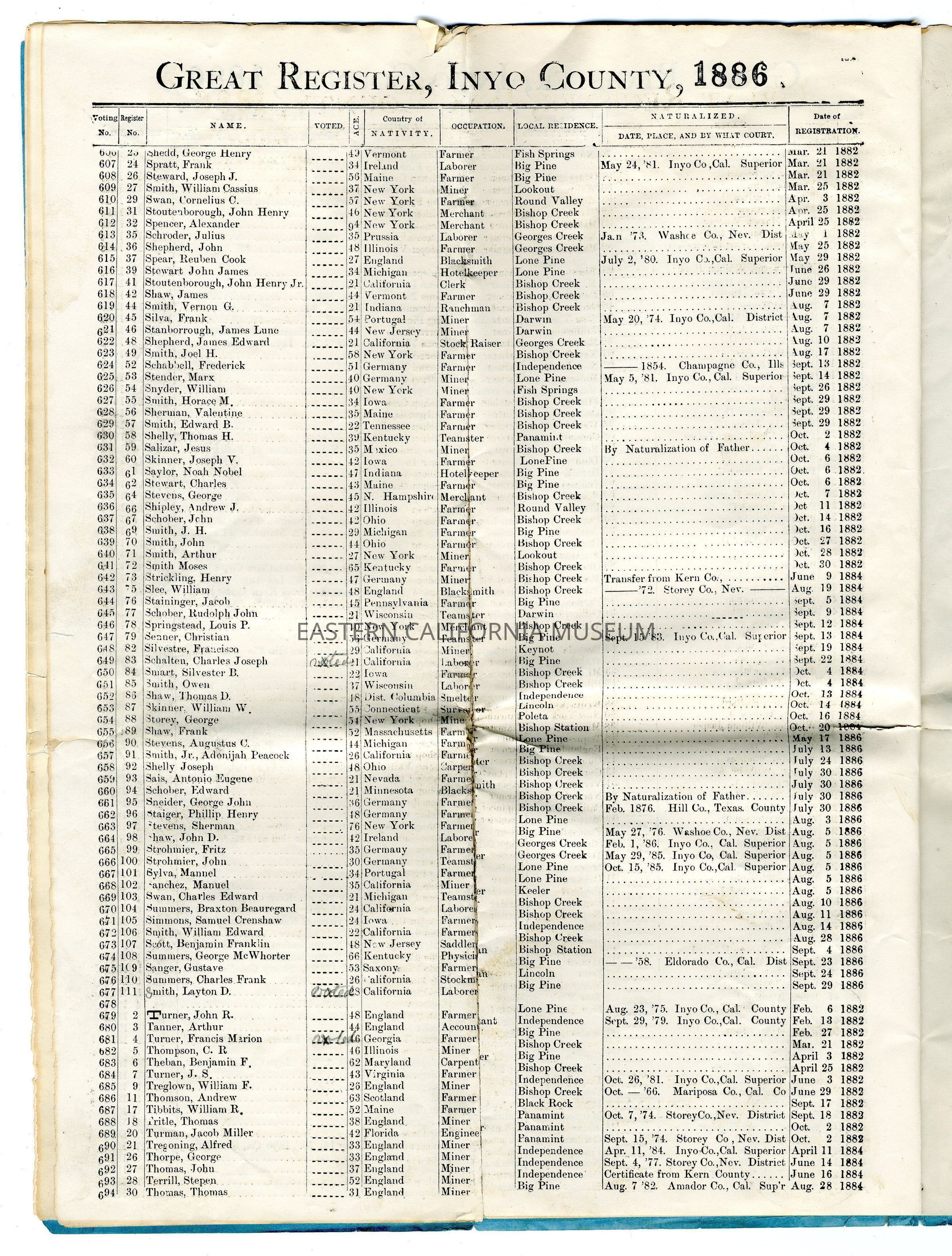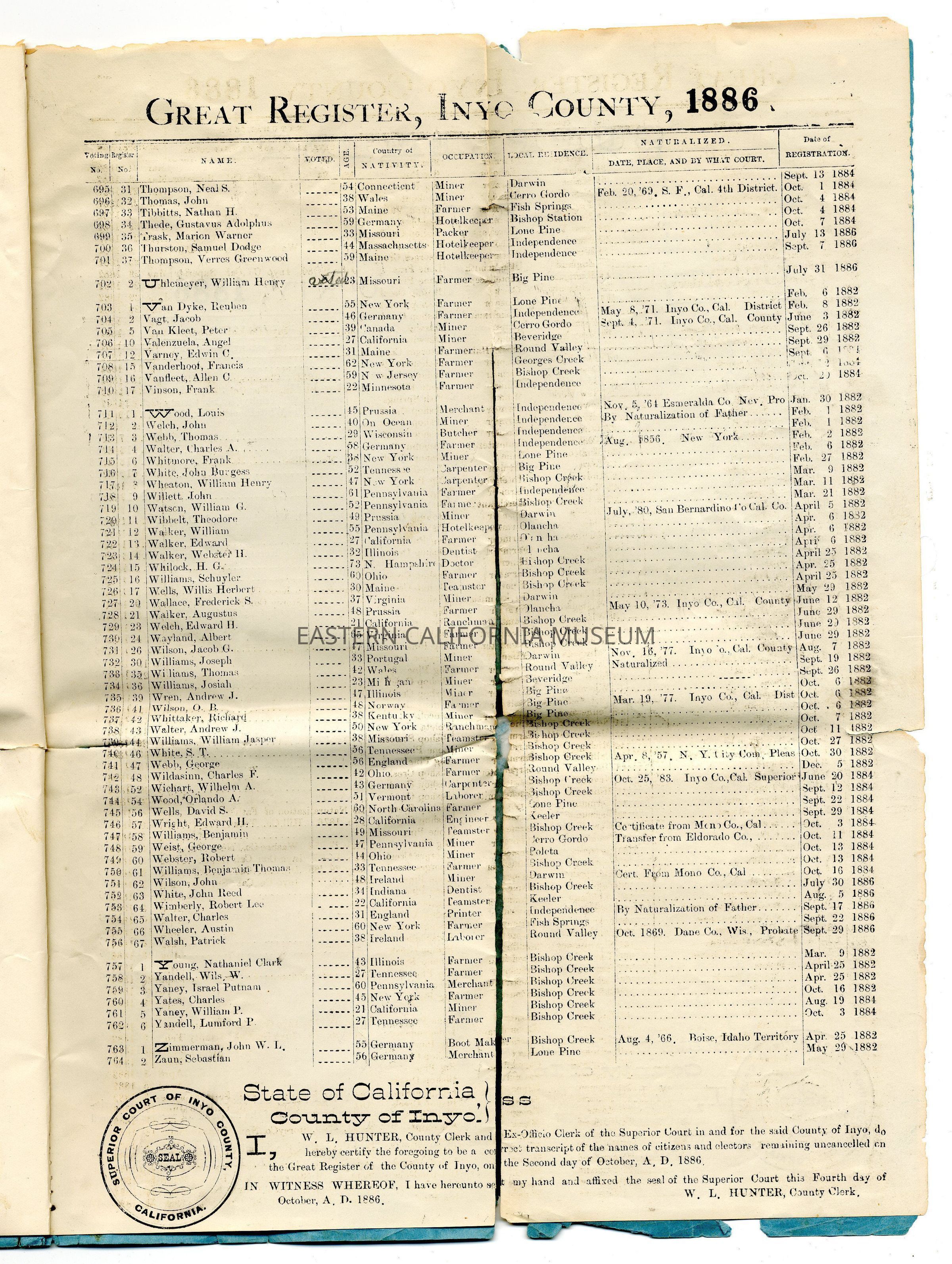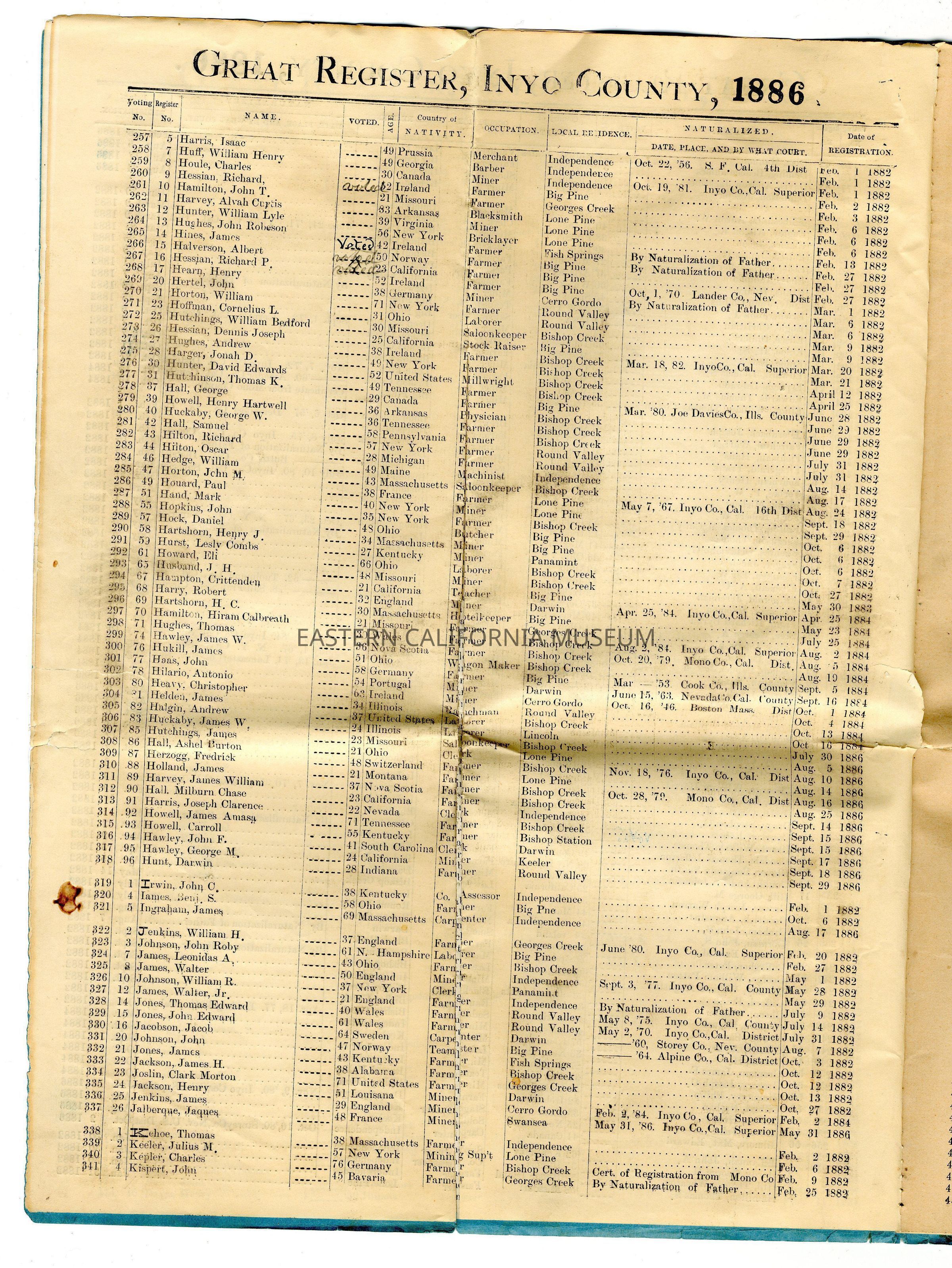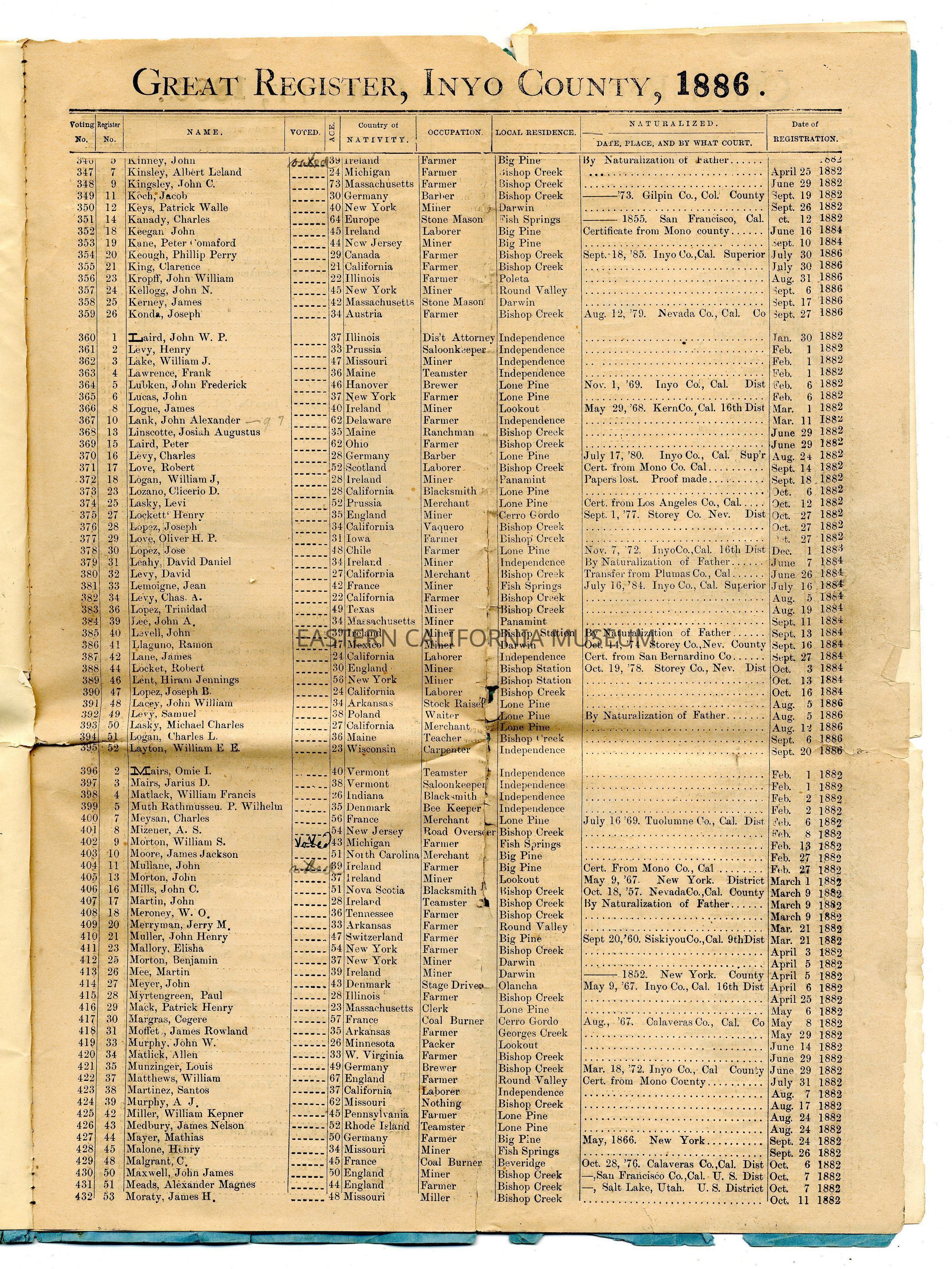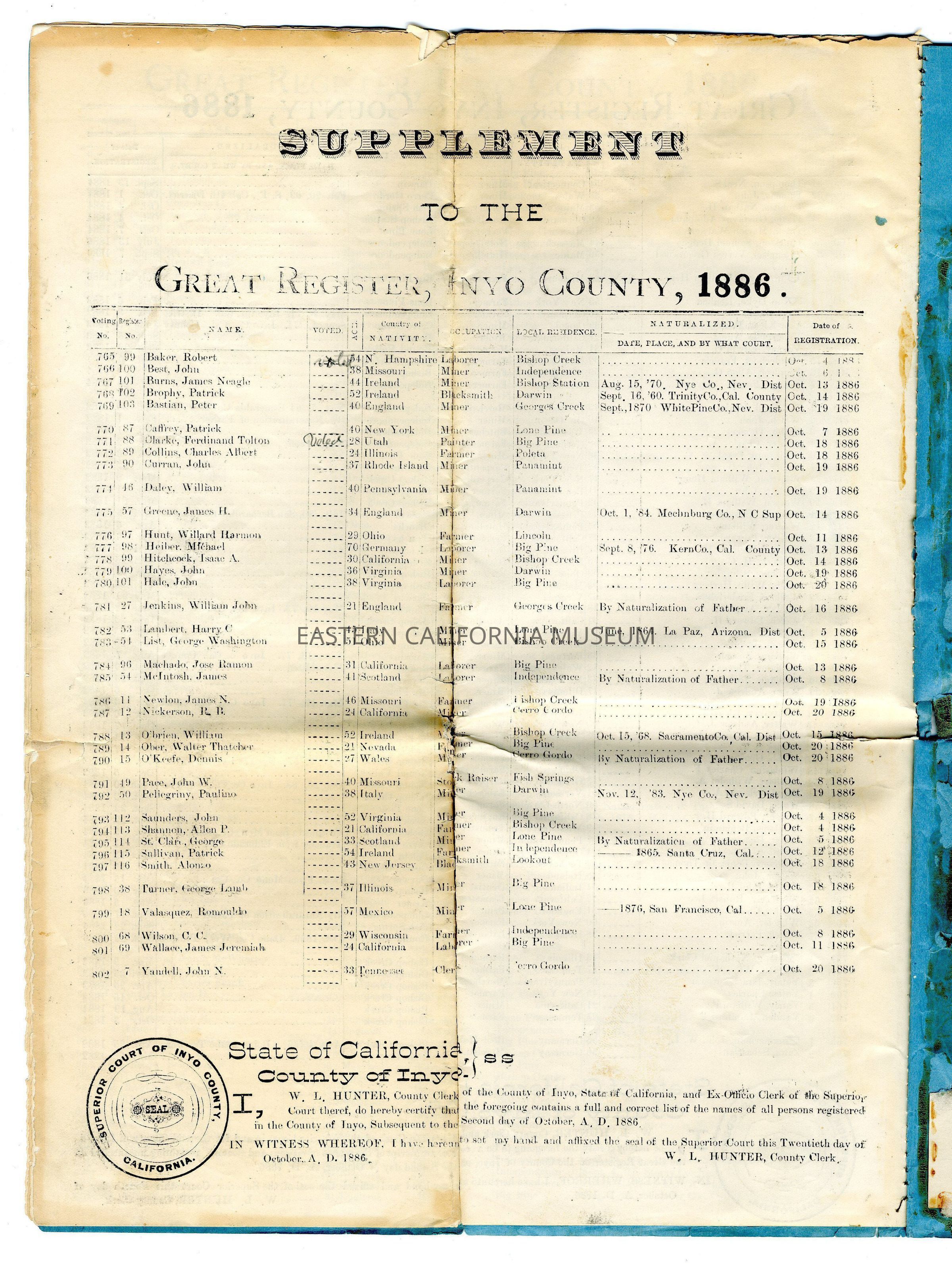 Copy of the Great Register of Inyo County, California, 1886Entry/Object ID