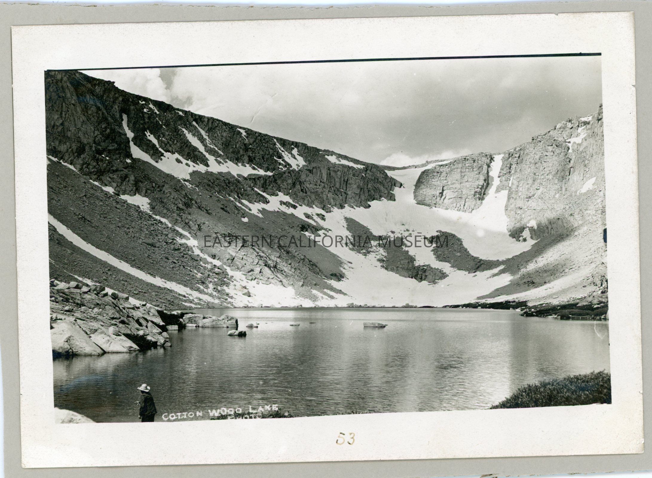Photo titled, "Cottonwood Lake" taken by photographer Fred Harvey. Someone has written "53" in ink along bottom edge of photo. It shows a man, likely A. C. Harvey, fishing in the lower left corner.Photograph Details