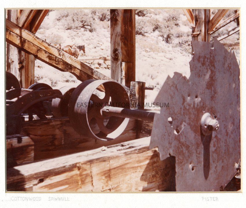 Mounted color photo of a timber structure that is identified as the Cottonwood Sawmill. Close-up photo of rusted metal machinery.Photograph Details