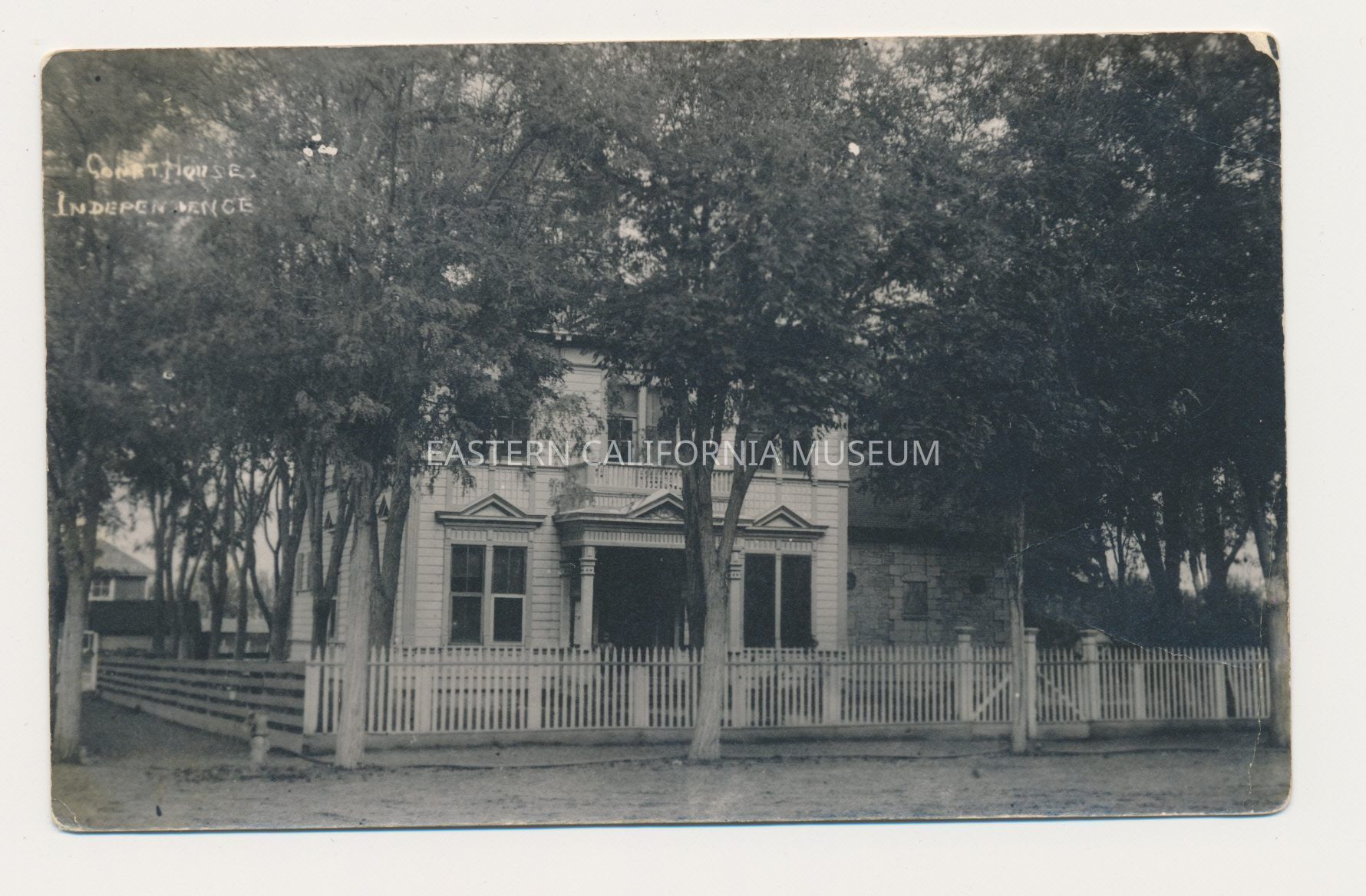 Photo postcard titled, "Court House, Independence." It shows the third Inyo County Courthouse and the stone building to the right of it is either the archive room or the jail. There is a white picket fence in front of it with horizontal fencing along the north side. Trees are obscuring the view of the second story.Photograph Details