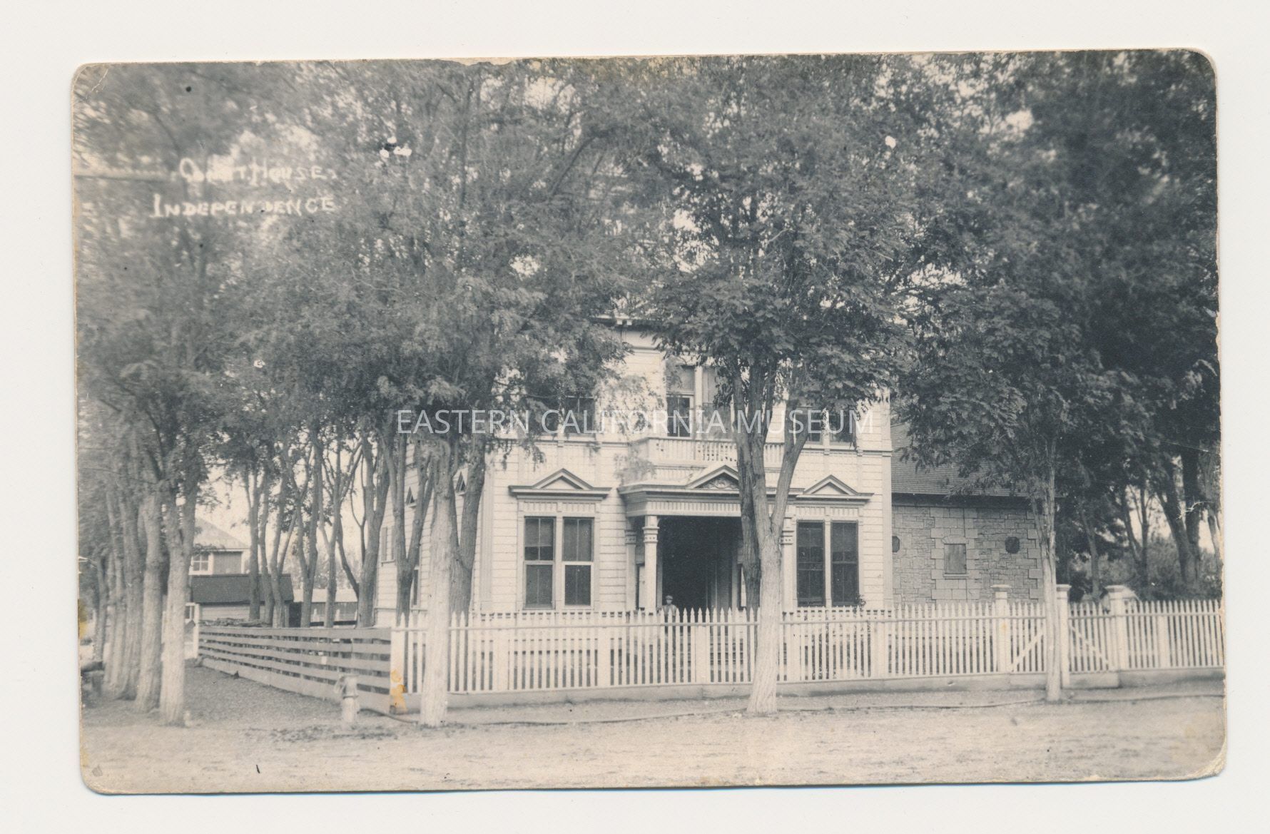 Photo postcard titled, "Court House, Independence." It shows the third Inyo County Courthouse and the stone building to the right of it is either the archive room or the jail. There is a white picket fence in front of it with horizontal fencing along the north side. Trees are obscuring the view of the second story.Photograph Details