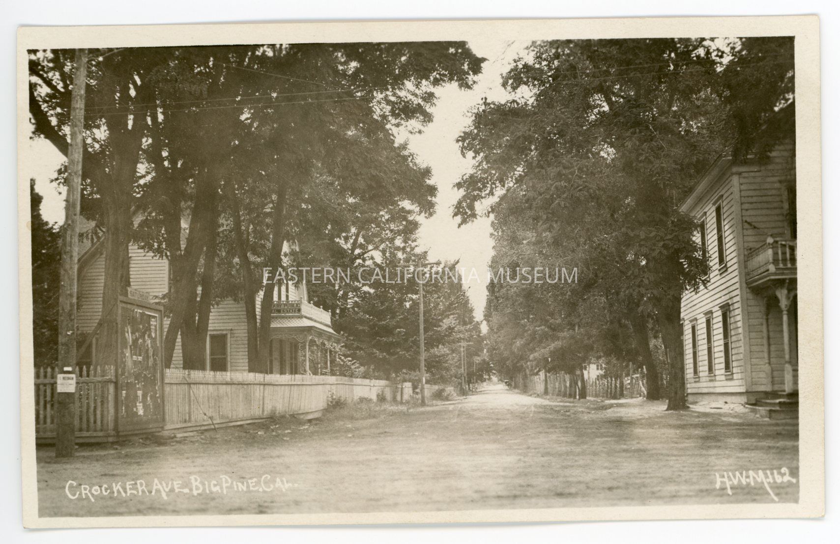 Photo postcard titled, "Crocker Ave. Big Pine, Cal." taken by photographer H. W. Mendenhall and given his ID #162. It shows a dirt street with two story buildings on either side. The building on the left has a partially obscured sign that says, "Notary Public / Real Estate." There is also a large poster board on the left side advertising something on Saturday. On the right is a building with a upstairs balcony that might be the Butler Hotel.Photograph Details
