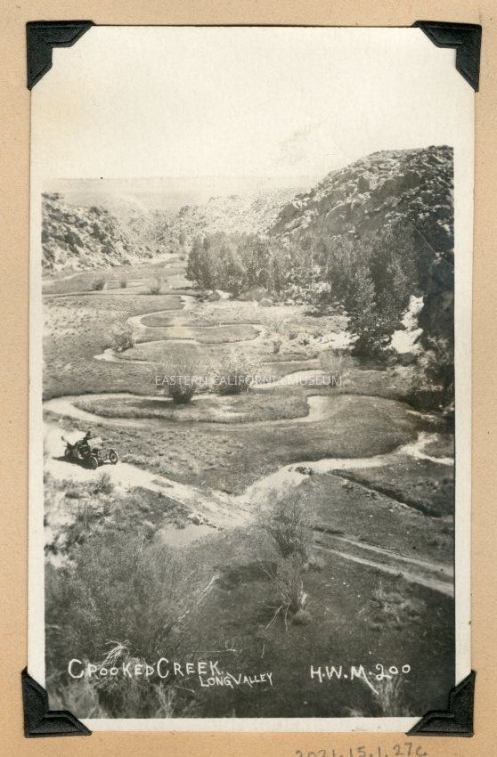 Photo postcard of Crooked Creek winding towards Long Valley. It is titled, "Crooked Creek Long Valley" and was taken by H. W. Mendenhall and given his photo #200.Collection