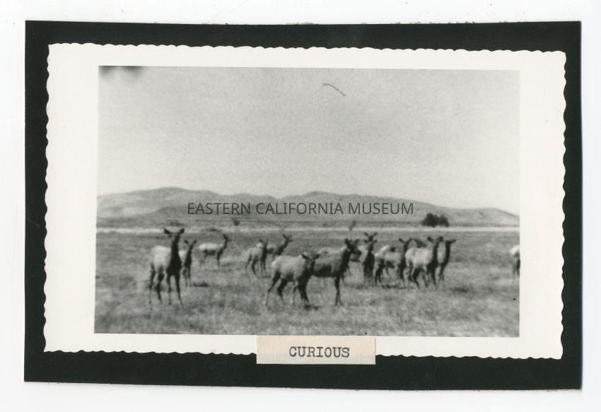 Blurry photo of a herd of elk in a field in the Tinnemaha area. The photo is printed on scalloped paper.