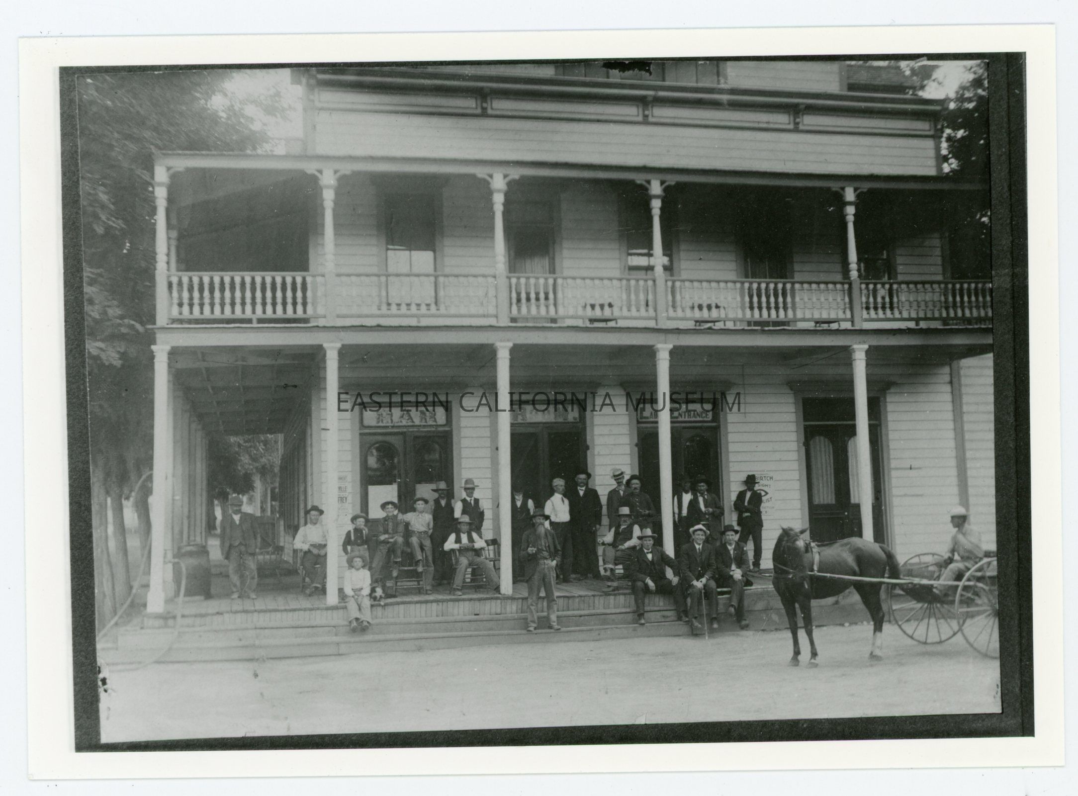 Copy of a photo of a large group of men and boys (about 23 total) on the porch of the two story Independence Hotel. There is a horse and buggy (with driver) to the right. Note on the far left side there appears to be a hose and faucet.