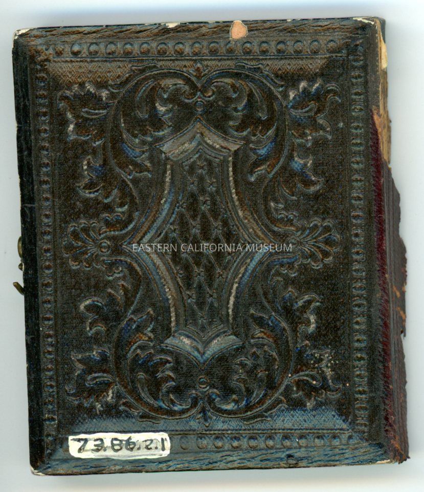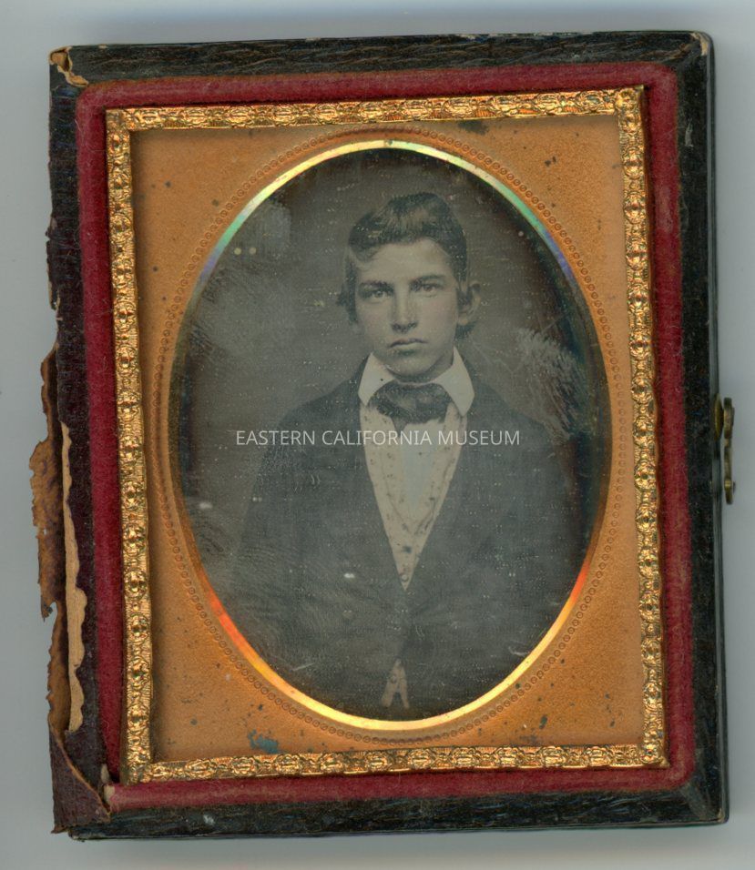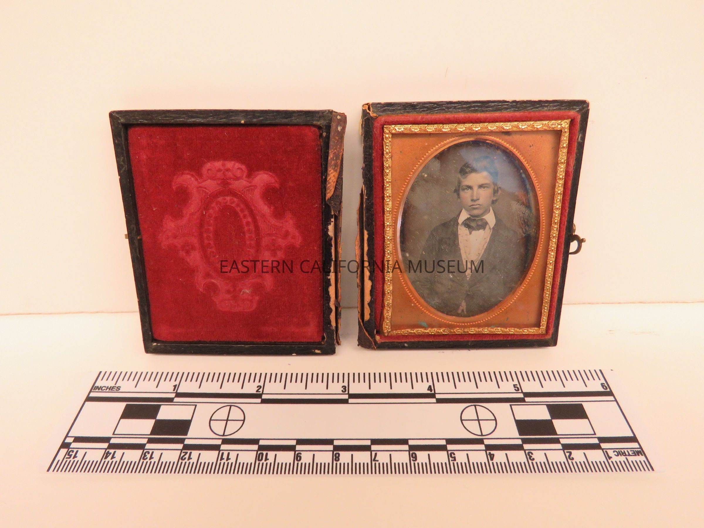Daguerreotype of an unidentified young man wearing a high collar, vest, and jacket. The ornate case it is housed in is broken into two pieces.Photograph Details