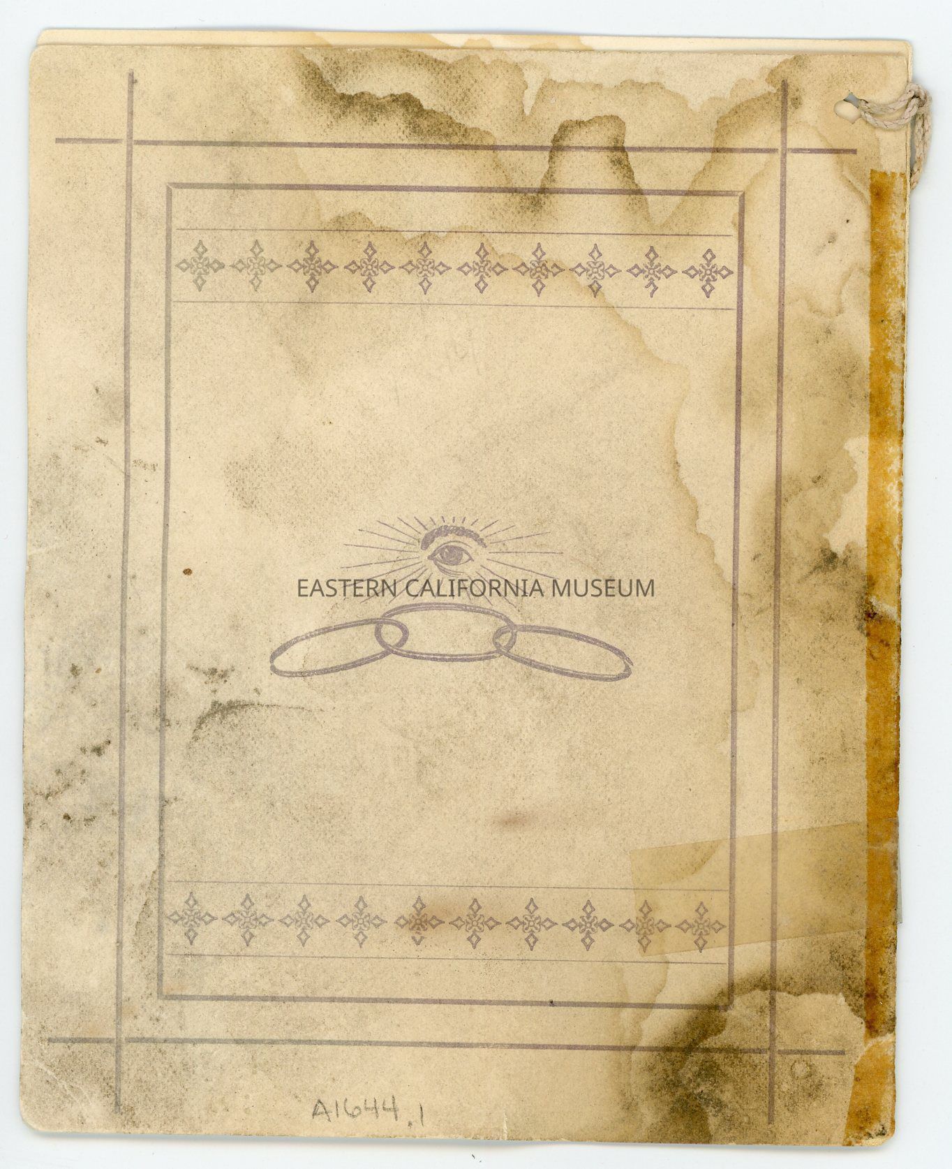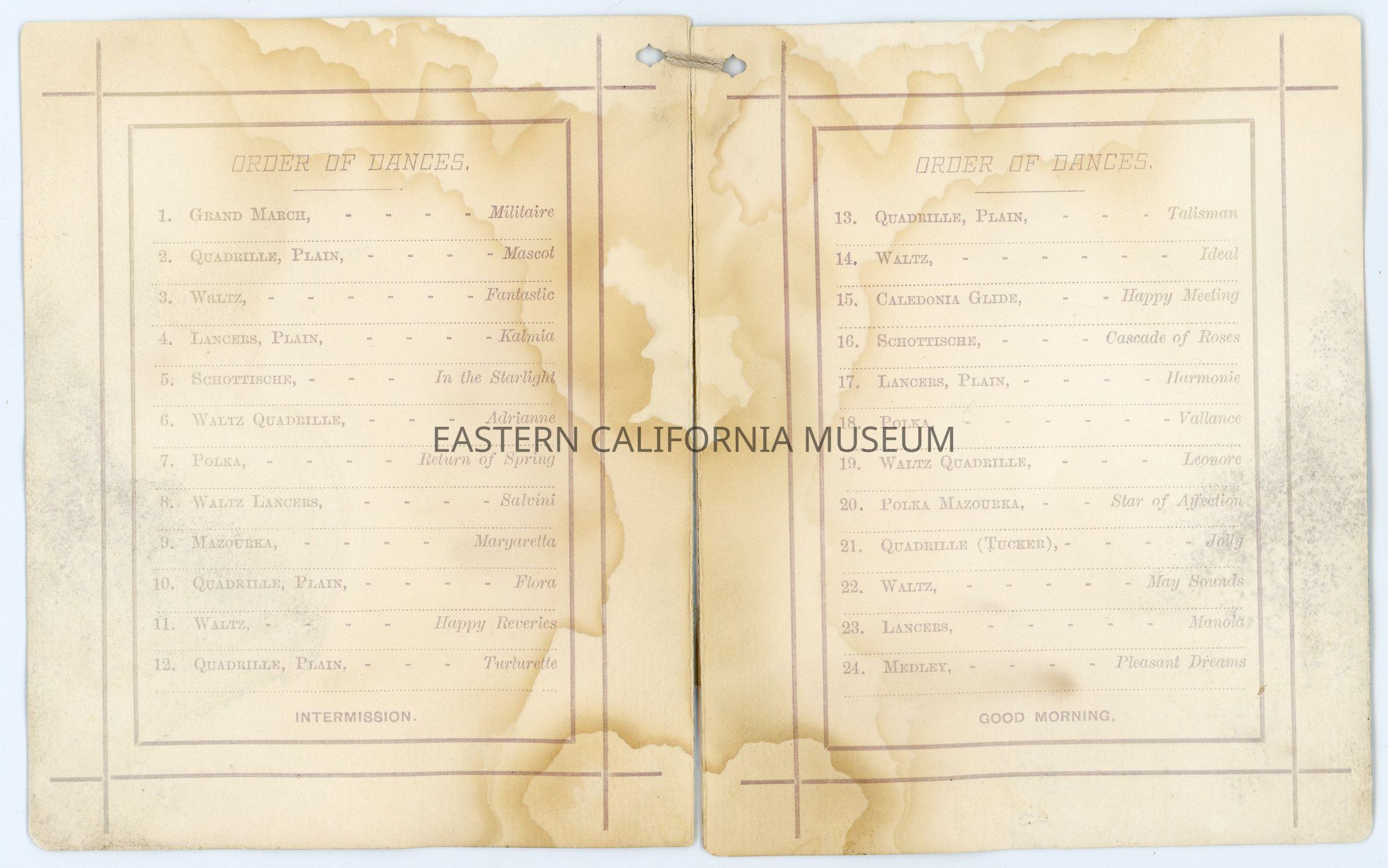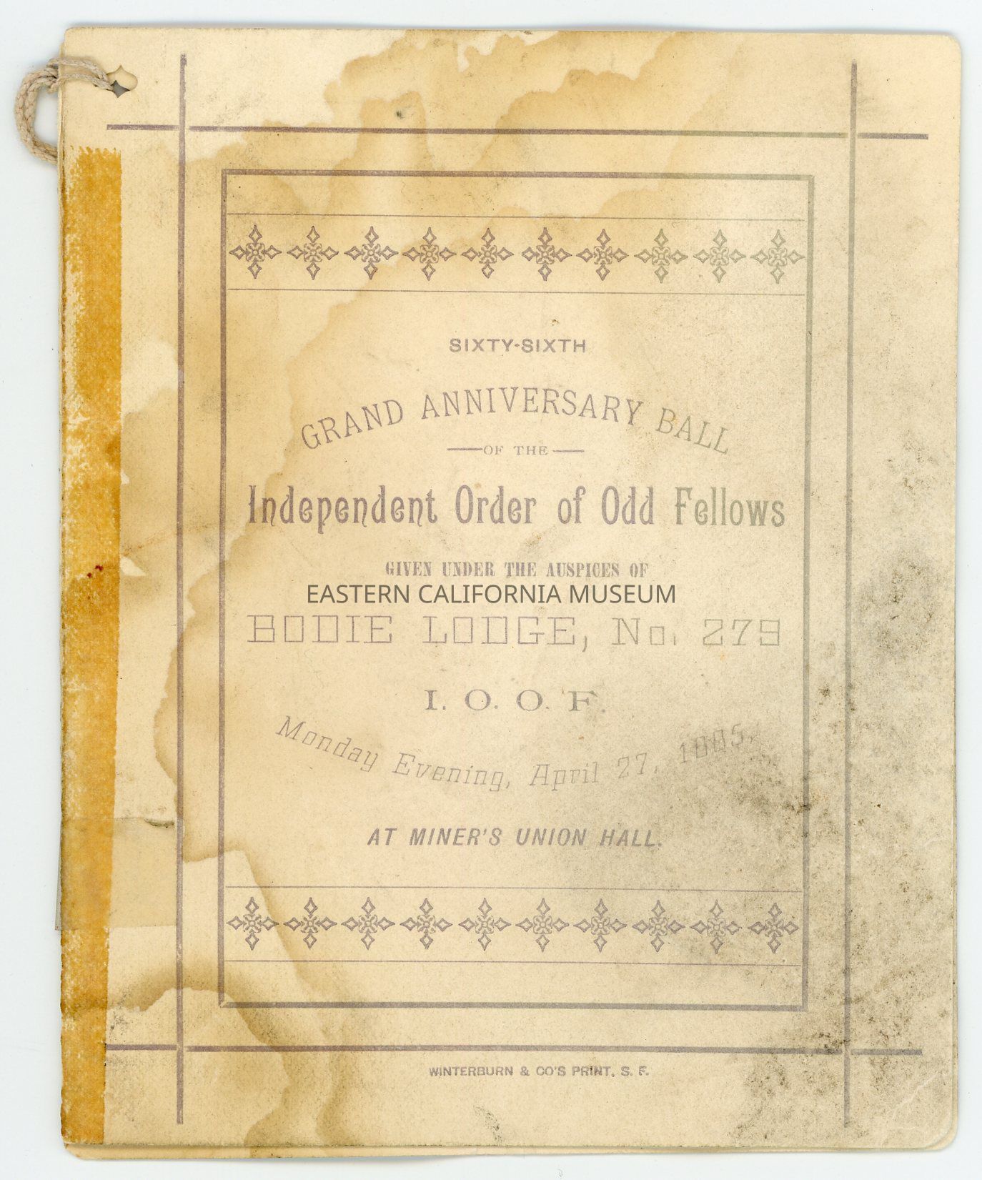 Dance card for the 66th Grand Anniversary Ball of the Independent Order of Odd Fellows given under the auspices of Bodie Lodge No. 279, I.O.O.F., Monday evening, April 27, 1885 at Miner's Union Hall. String tied in the upper left corner.