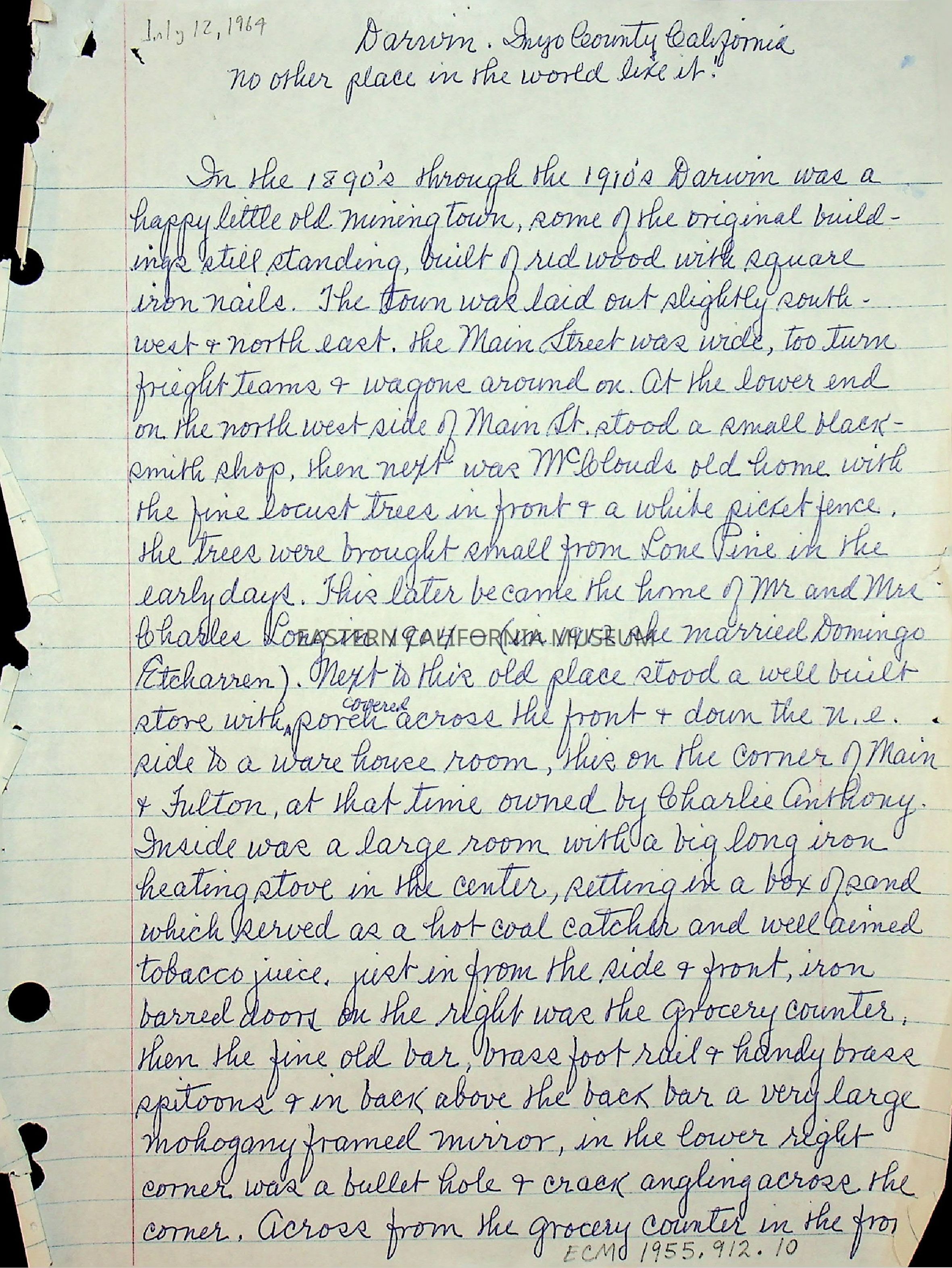 Handwritten manuscript titled, "Darwin, Inyo County, California: No Other Place in the World Like It" written by Elizabeth L. Mecham in 1964. 36 pages.Collection