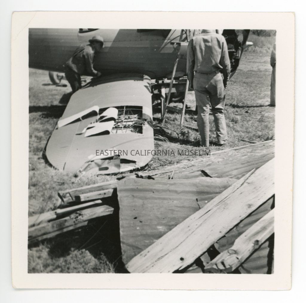 2000.5.18--Photo of two men examining a plane wreck. This plane, while damaged, is still mostly intact.