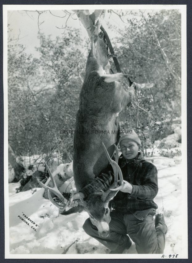 [No label, but it is described in the inventory as "Man and deer in snow."] Frasher's Pomona Cal. A-478