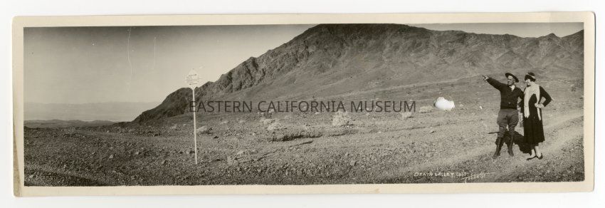 Panorama photo of a man and woman standing near a road sign in Death Valley. The sign has directions and distances to water, Beatty, Emigrant Springs, and Ballarat. There is a cardboard sign on the ground below it that says "Stove Pipe Wells Bungalette City." The photo is titled, "Death Valley, Calif." and the photographer is Tebbetts.