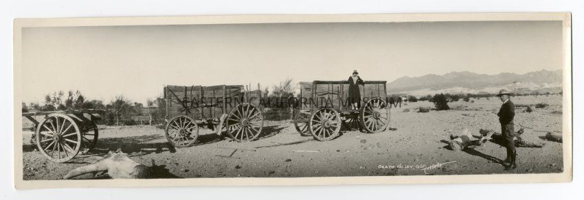 Panorama photo of a man and woman posing with three old wagons. It is titled, "Death Valley, Calif." and the photographer is Tebbetts.