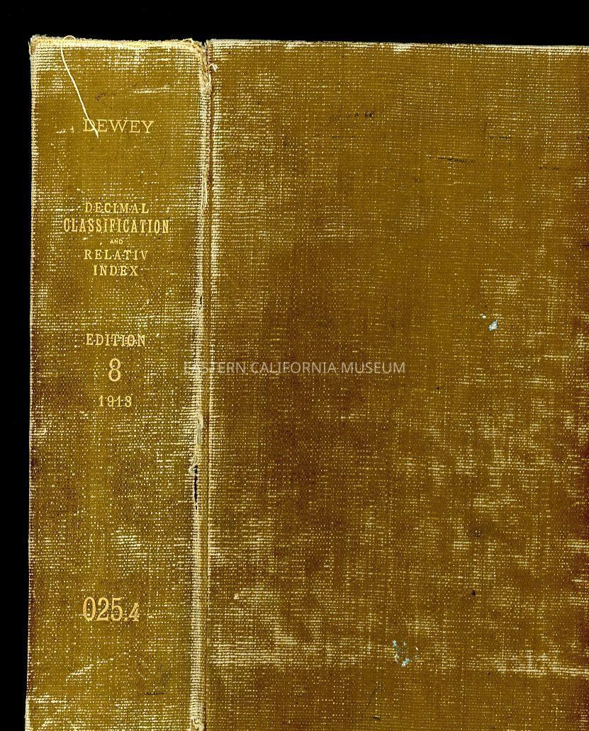 "Decimal Classification and Relativ Index" is No. E 980 and was previously owned by the Inyo County Free Library. Binding is loose.Book Details