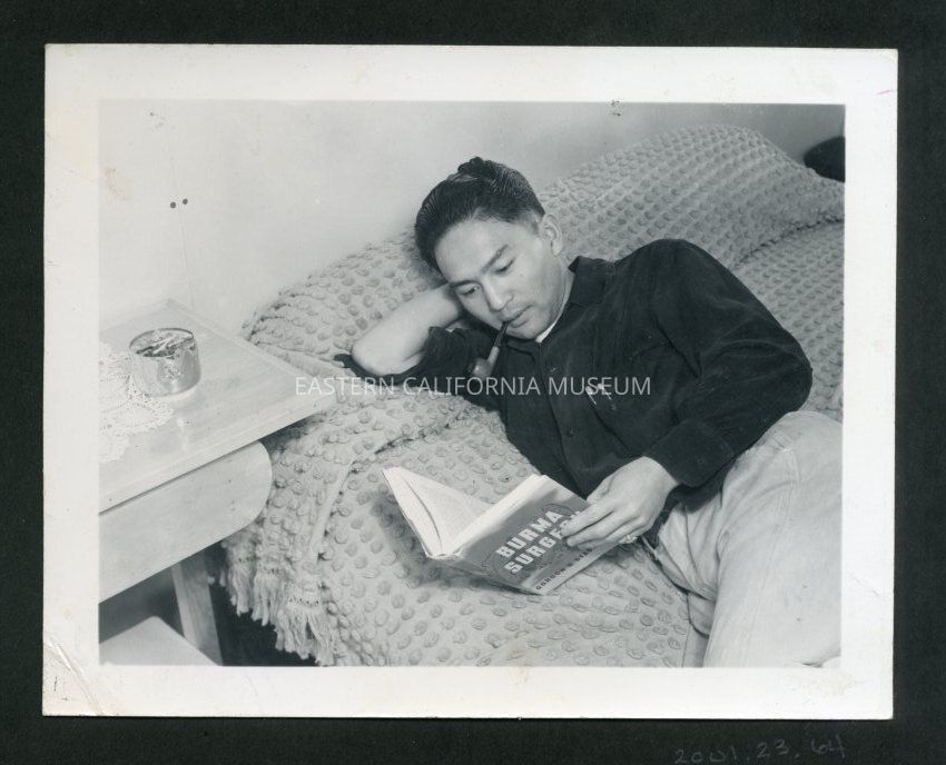 Photograph taken by Ansel Adams of a man reading a book while reclining on a bed. He has a pipe in his mouth. He is Dennis Shimizu.